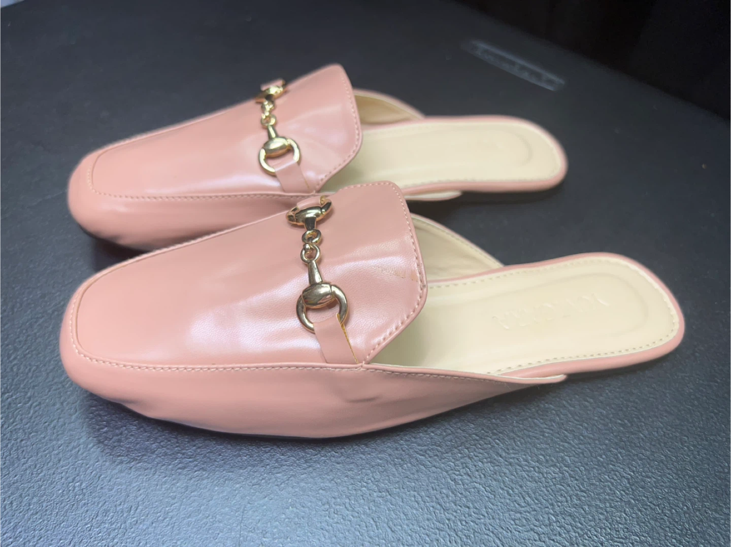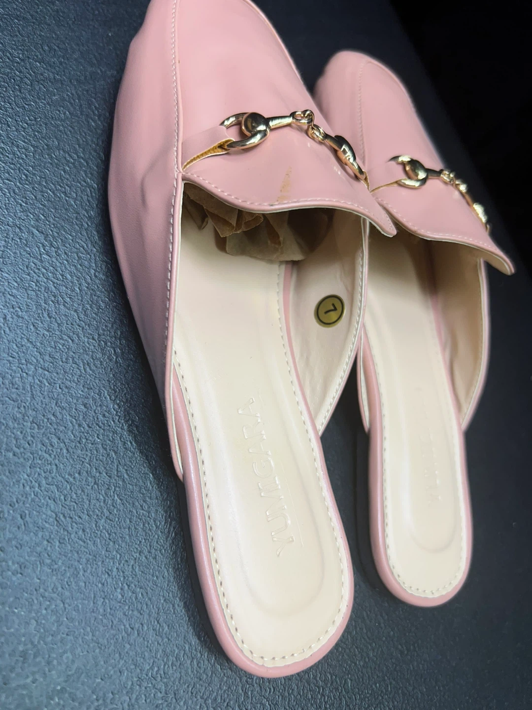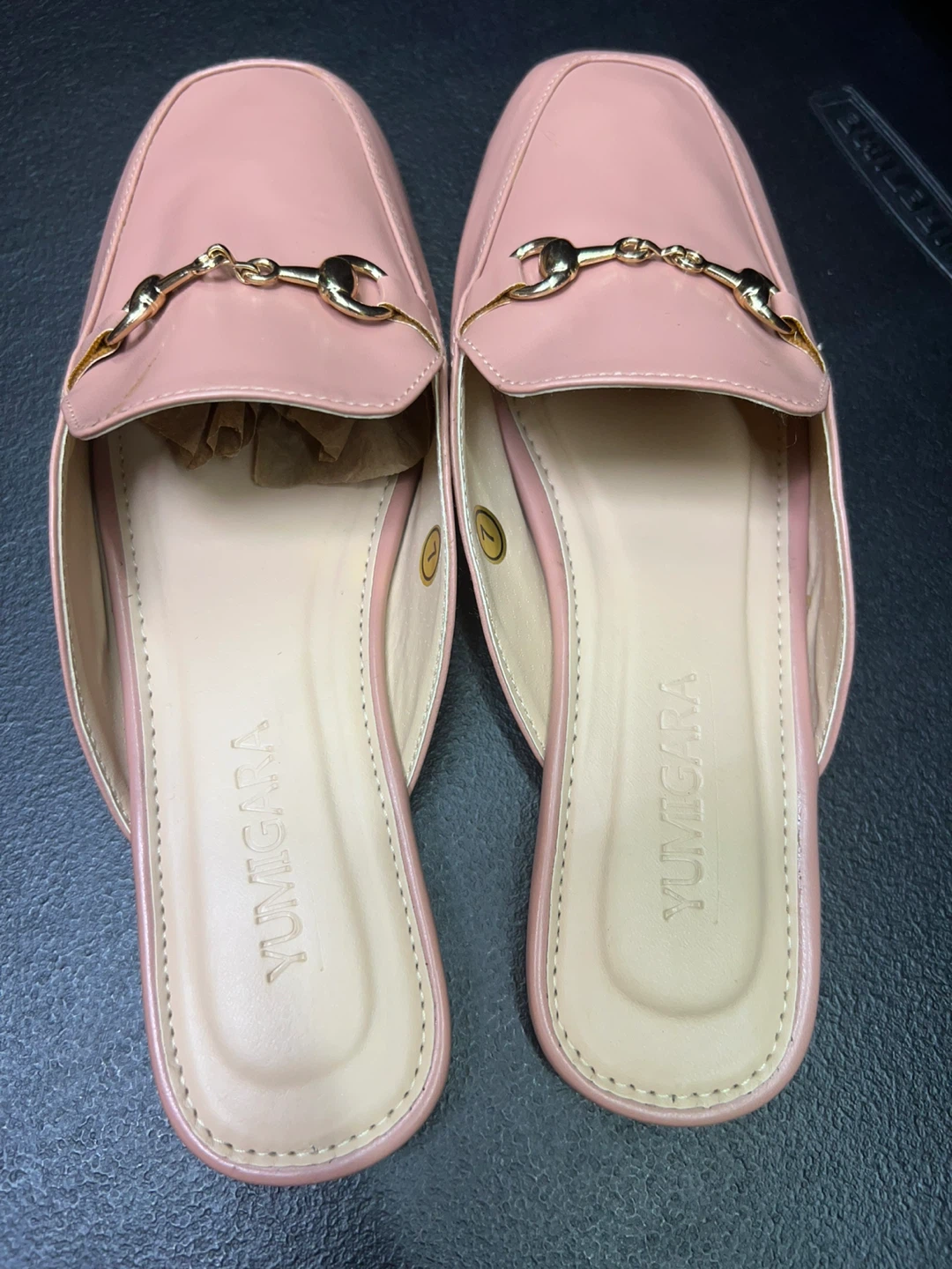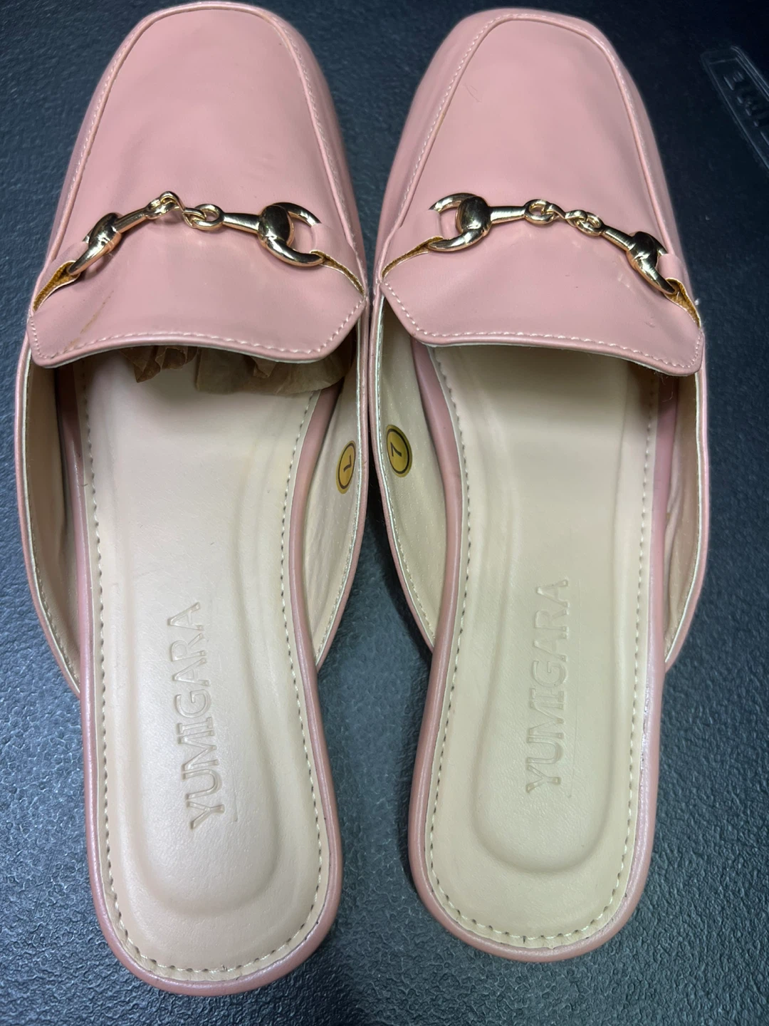 Yumigara pink slip-on mules with gold hardware. Synthetic material. Size 7. These slides are easy to wear!