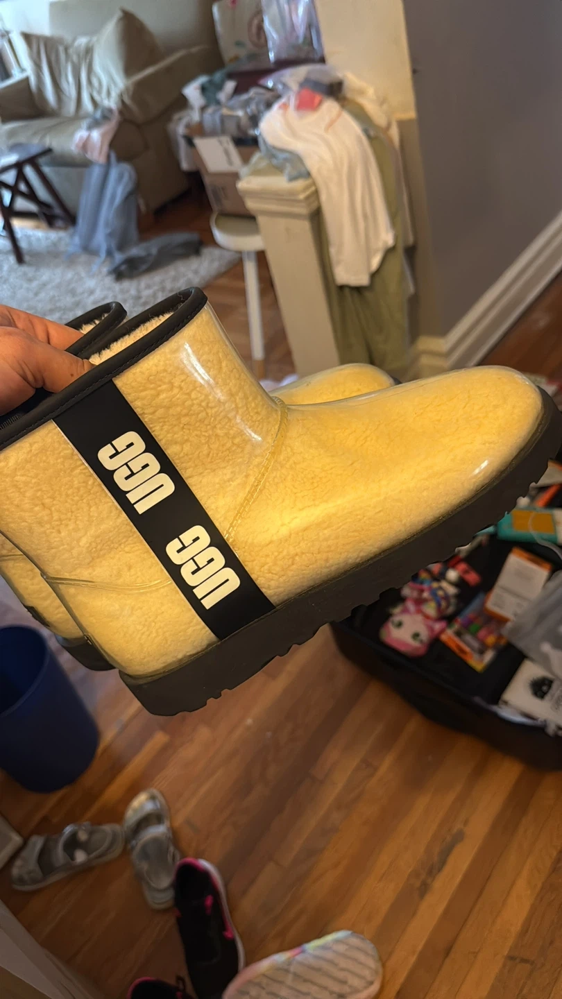 UGG clear yellow boots. Features UGG logo band. Sheepskin lining visible. Rubber sole. size 11 women
