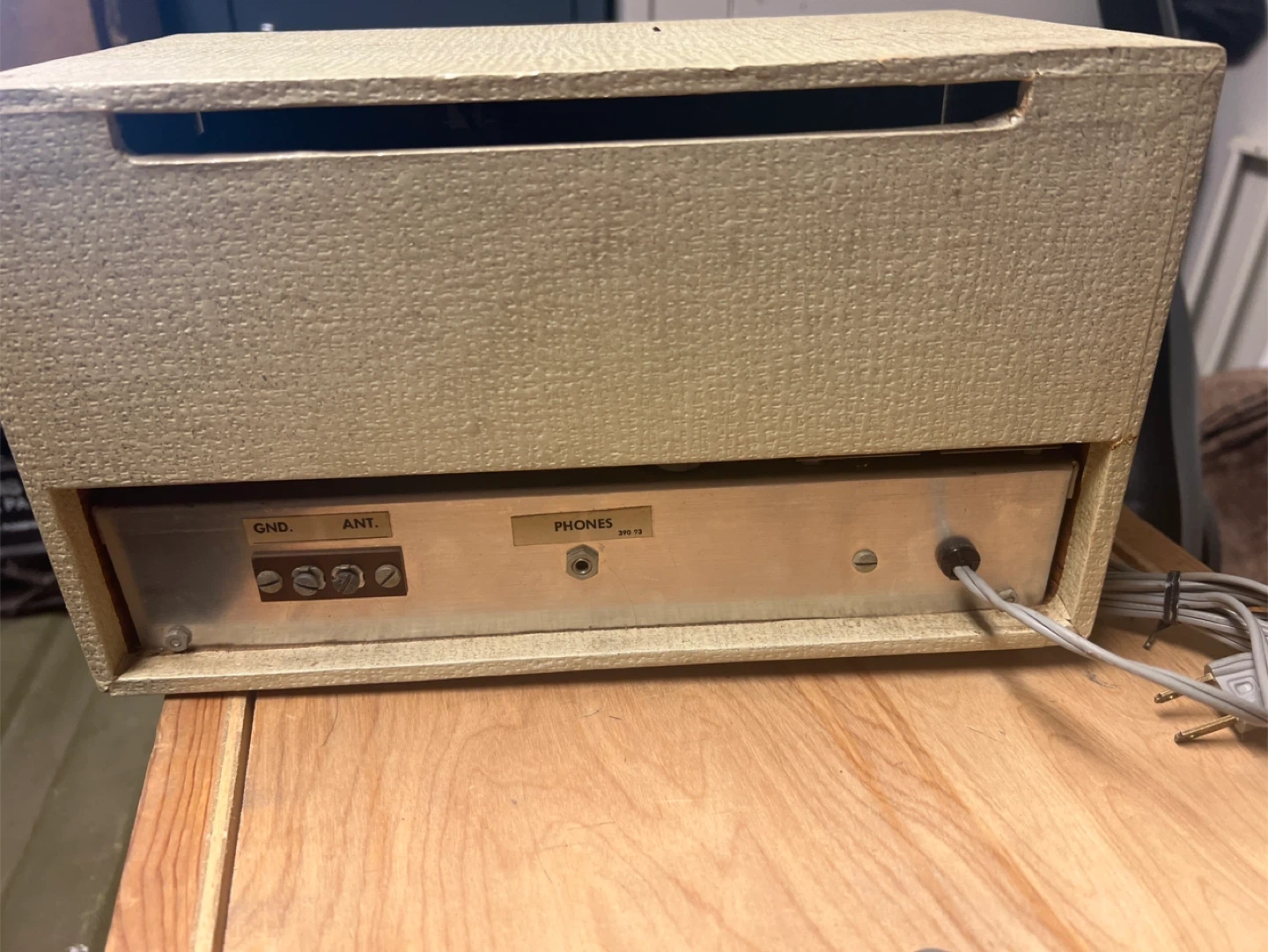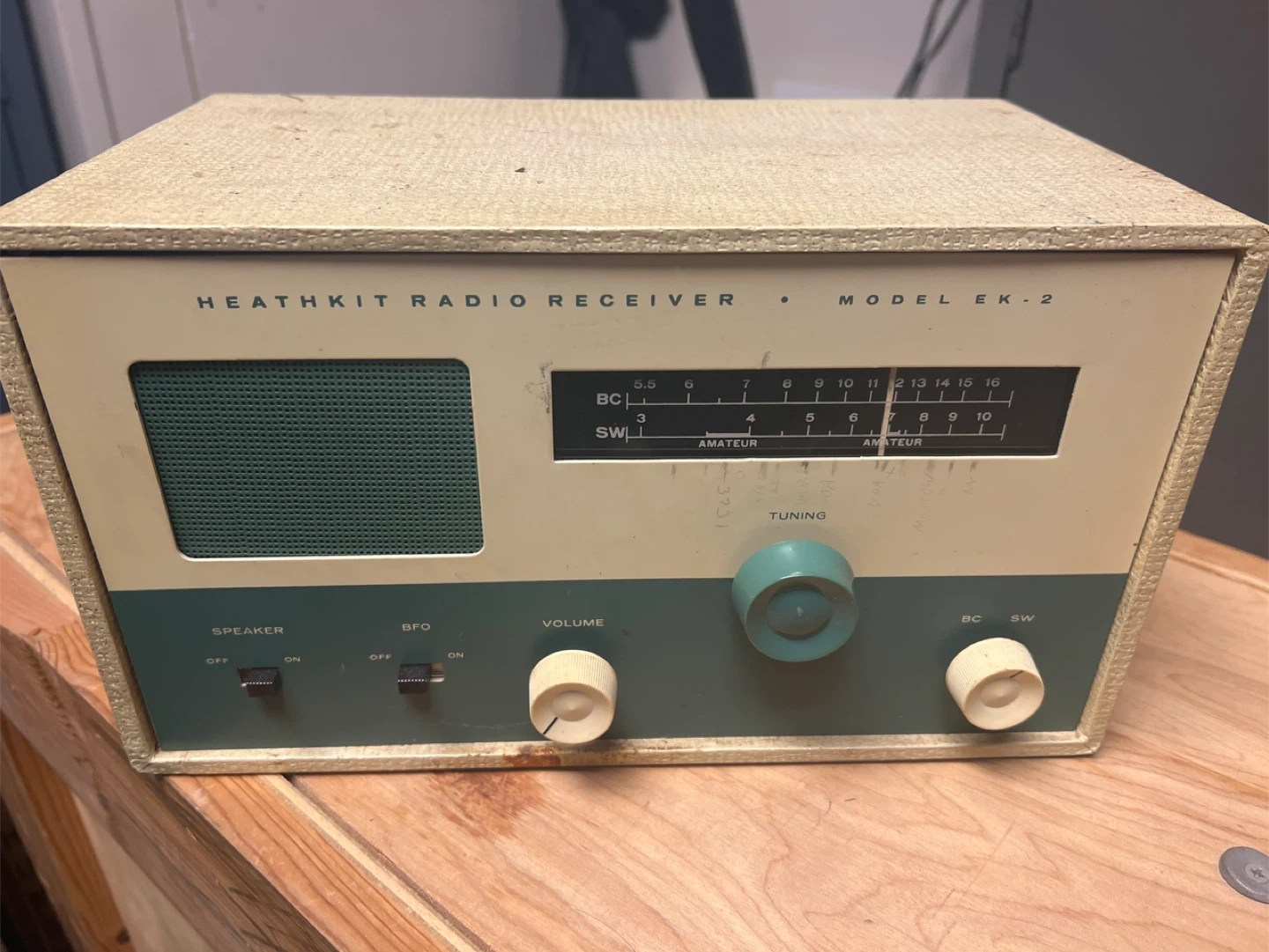 This is a vintage Heathkit radio receiver, model EK-2. It features volume and tuning knobs, with controls for speaker, BFO, and band switching. Connect an antenna and ground for operation. Includes a headphone jack on the back.