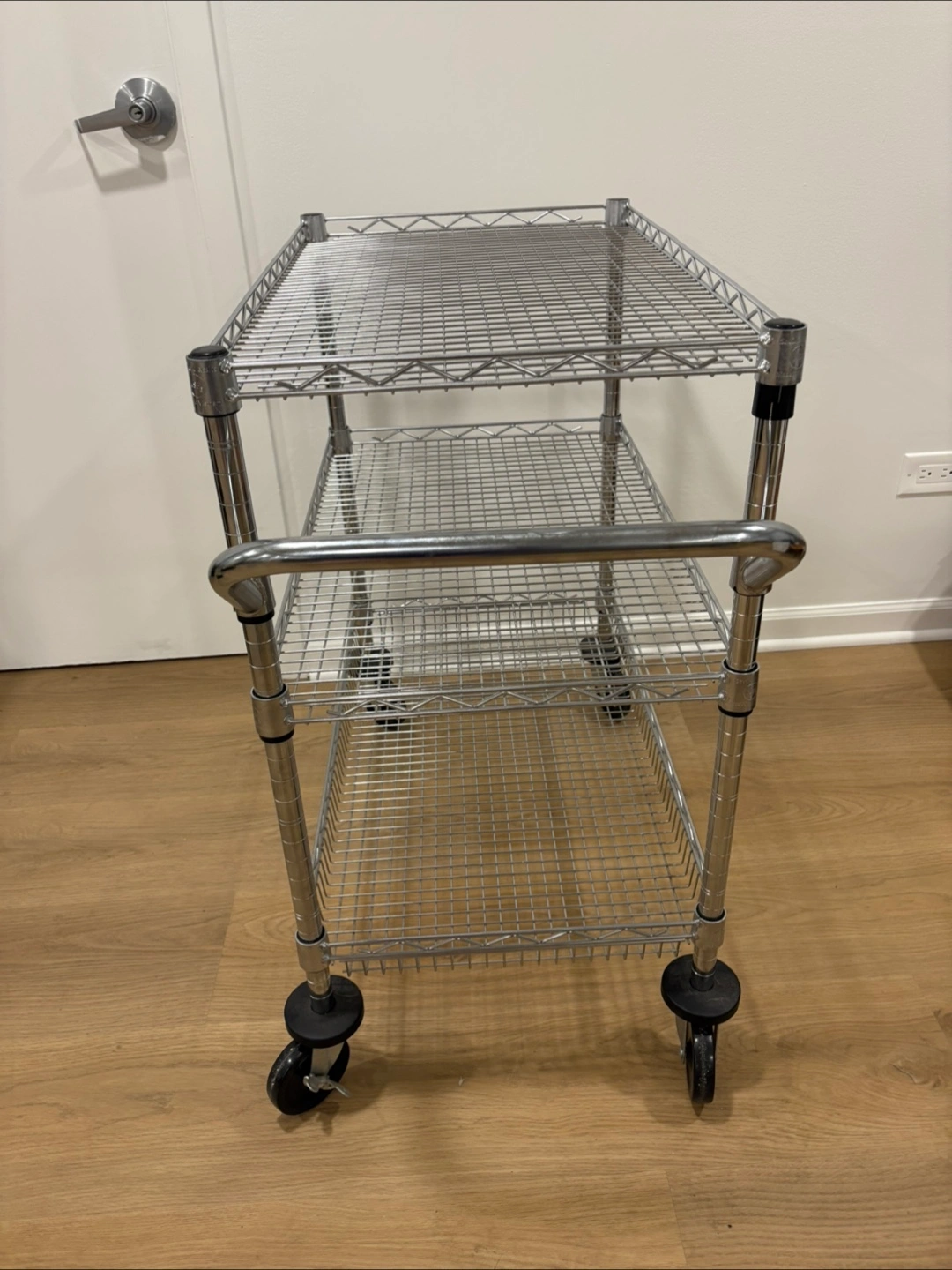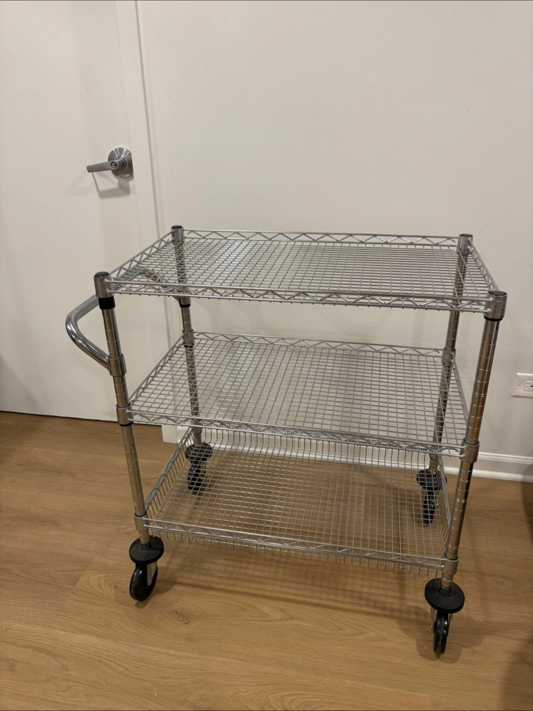 I'm selling a 3-Tier Metal Wire Utility Cart! It's in great condition and ready to help you organize your space. The cart features a sturdy metal wire construction and smooth-rolling casters for easy mobility. Perfect for use in the kitchen, garage, or office!