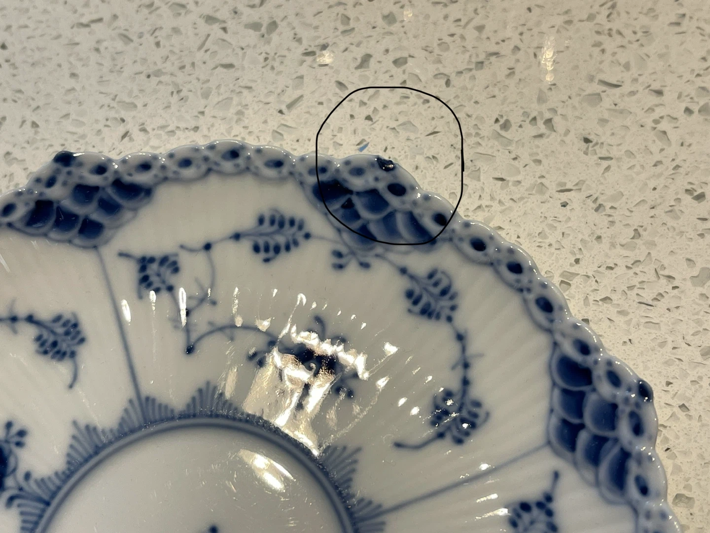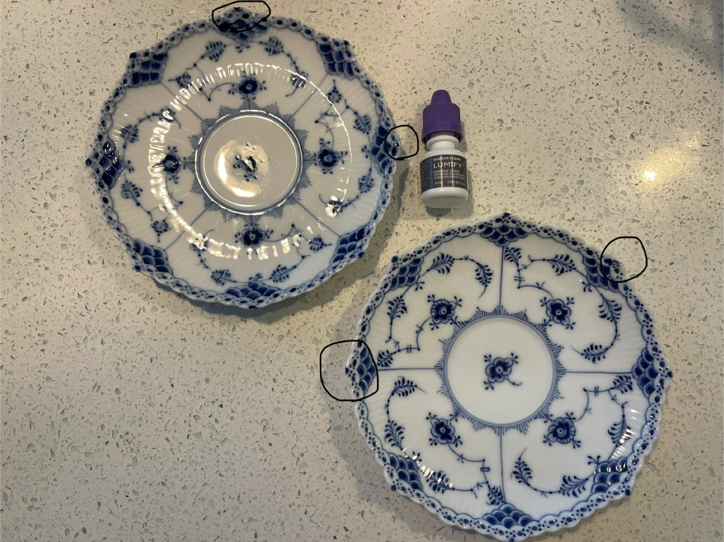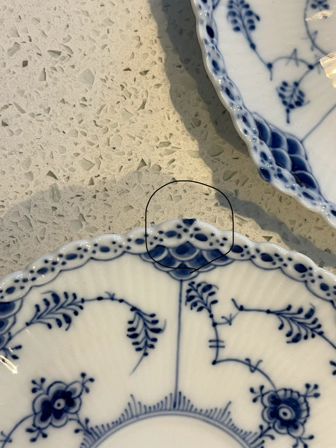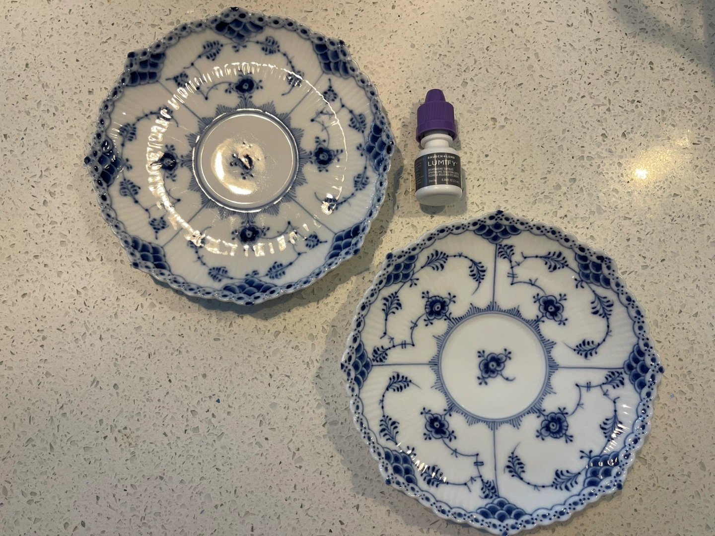 Two Royal Copenhagen Blue Fluted Plain plates. These plates feature a delicate blue floral pattern on white porcelain. They're perfect for serving desserts or as decorative accent pieces.