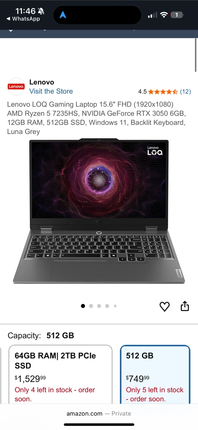 Lenovo LOQ Gaming Laptop with a 15.6" FHD display. It's powered by an AMD Ryzen 5 7235HS processor and NVIDIA GeForce RTX 3050 graphics. This model has 12GB RAM and a 512GB SSD,