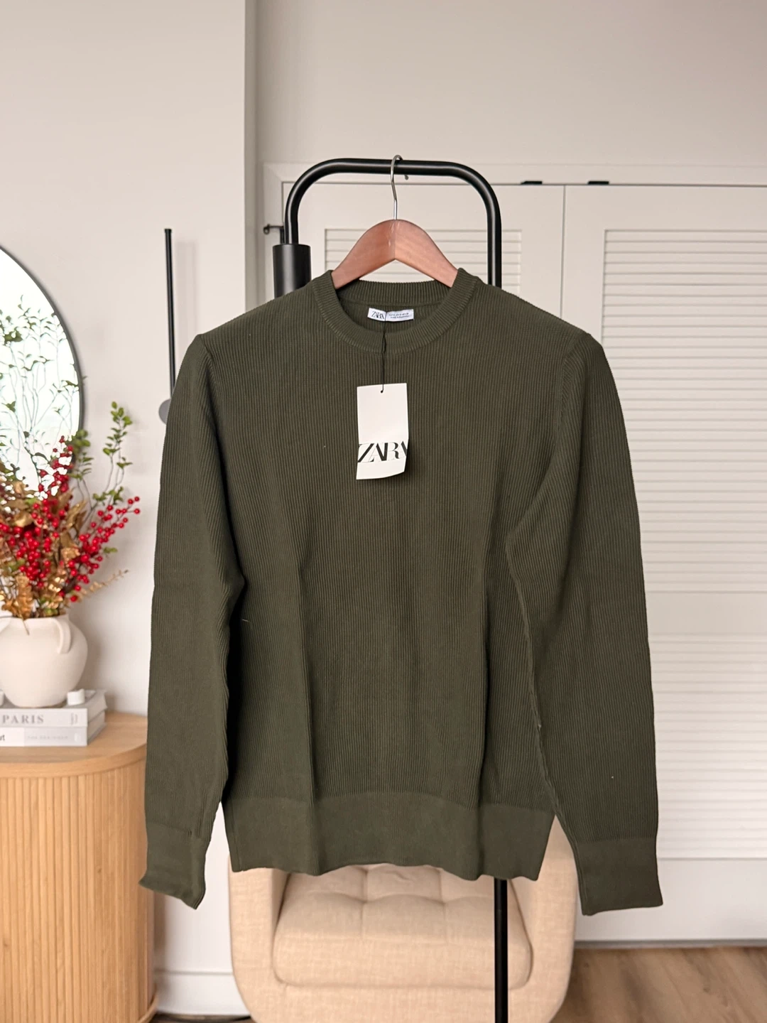 This is a ZARA ribbed crewneck sweater in olive green. It's a size medium. The material feels like a comfortable knit. This sweater offers a classic look for everyday wear!