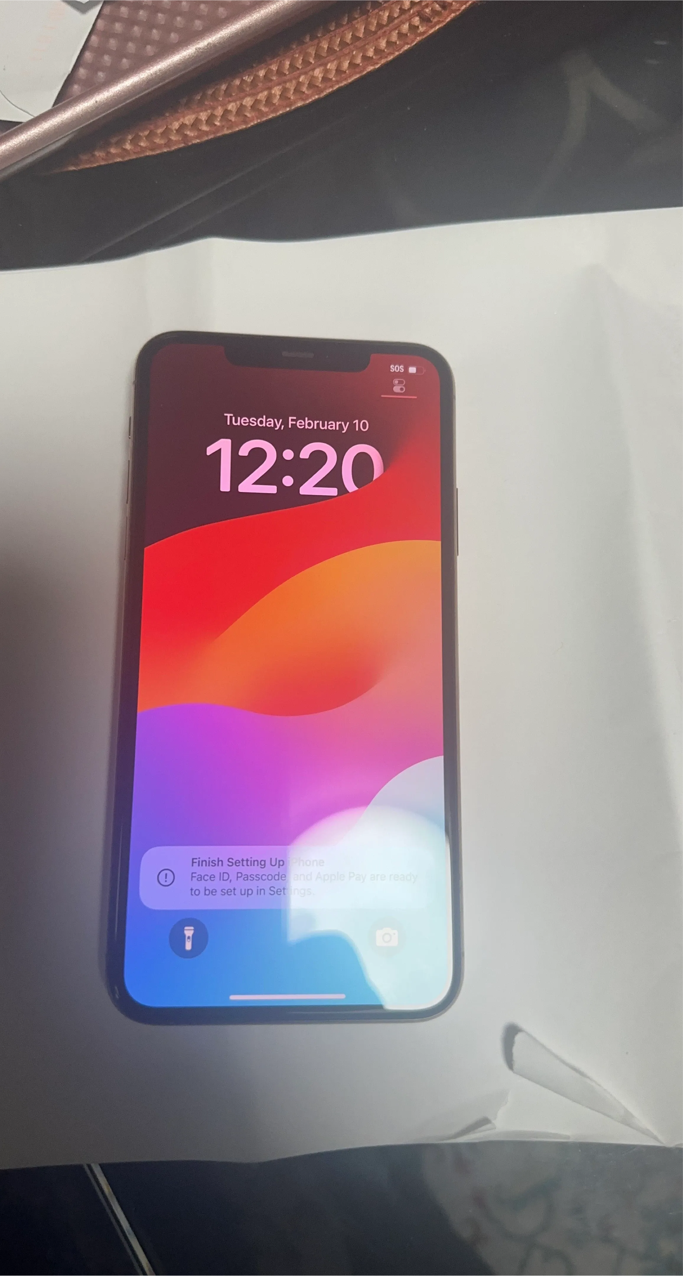 This is an Apple iPhone. It's ready to be set up with Face ID, Passcode, and Apple Pay. The date on screen is Tuesday, February 10.