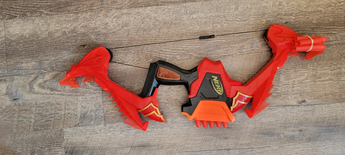 Red and black Nerf bow. Features a string and a handle. Made of plastic. Excellent works g condition includes ammo