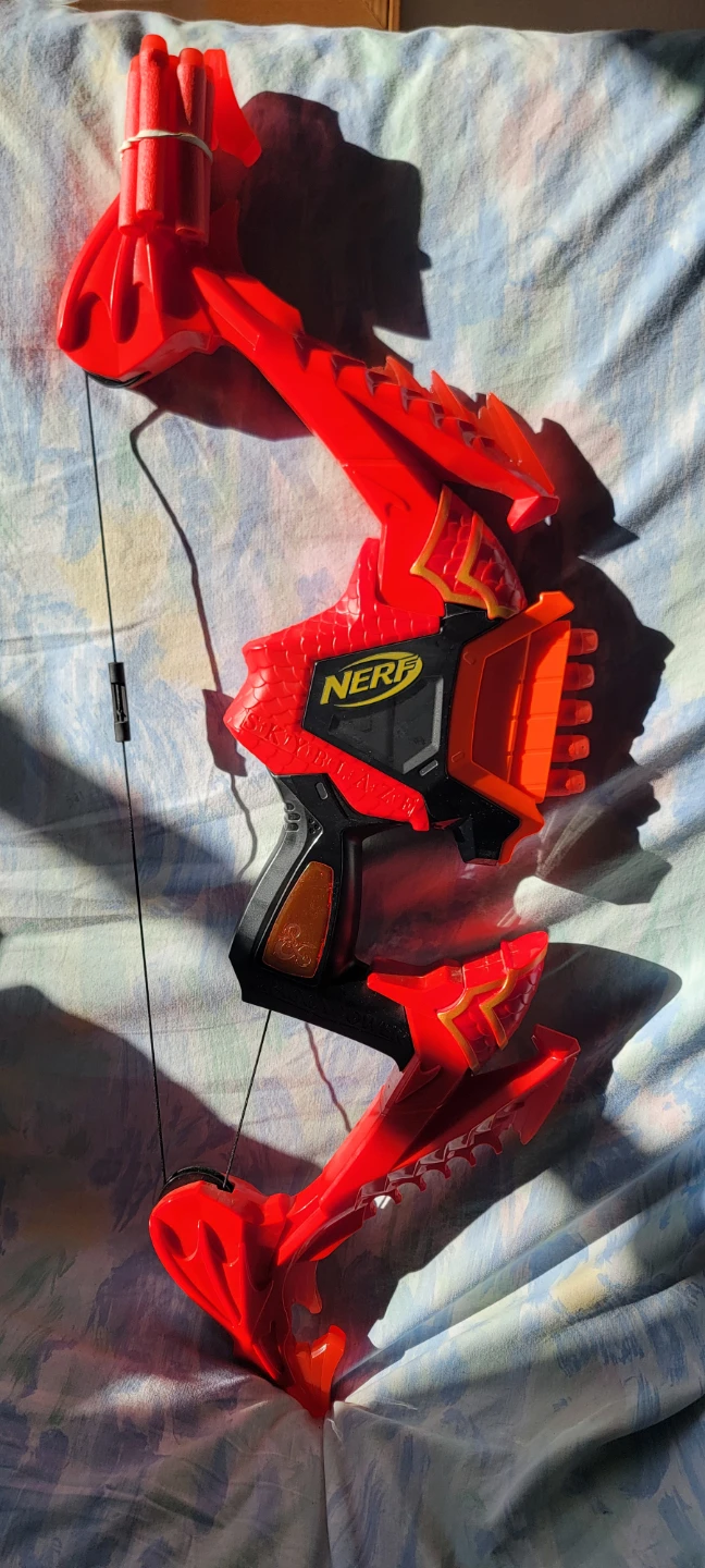 Red and black Nerf bow. Features a string and a handle. Made of plastic. Excellent works g condition includes ammo