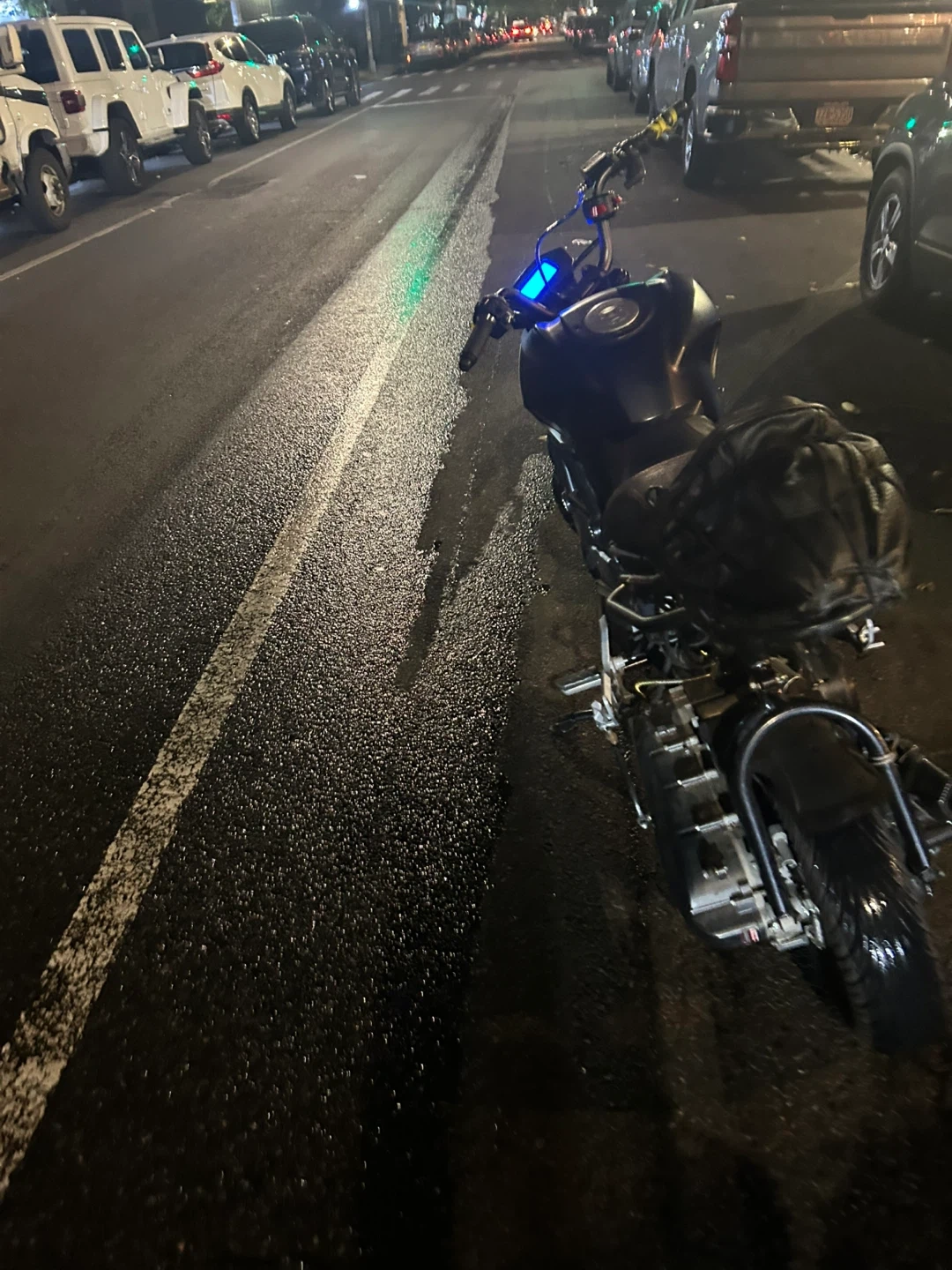 A black motorcycle is equipped with a black saddlebag attached to the rear. A TROY LEE helmet, primarily blue and white, is also shown. It's a street motorcycle.
