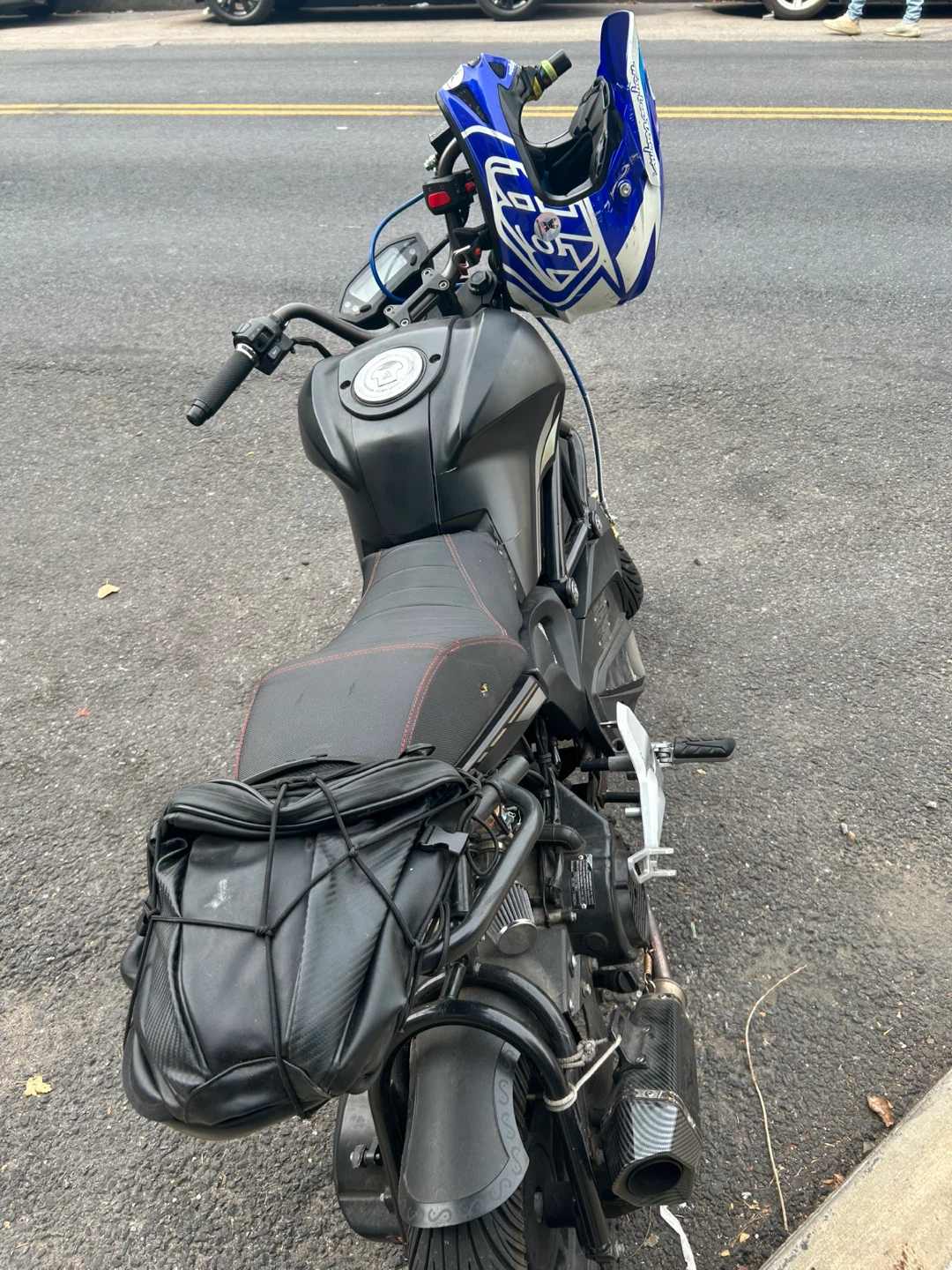 A black motorcycle is equipped with a black saddlebag attached to the rear. A TROY LEE helmet, primarily blue and white, is also shown. It's a street motorcycle.