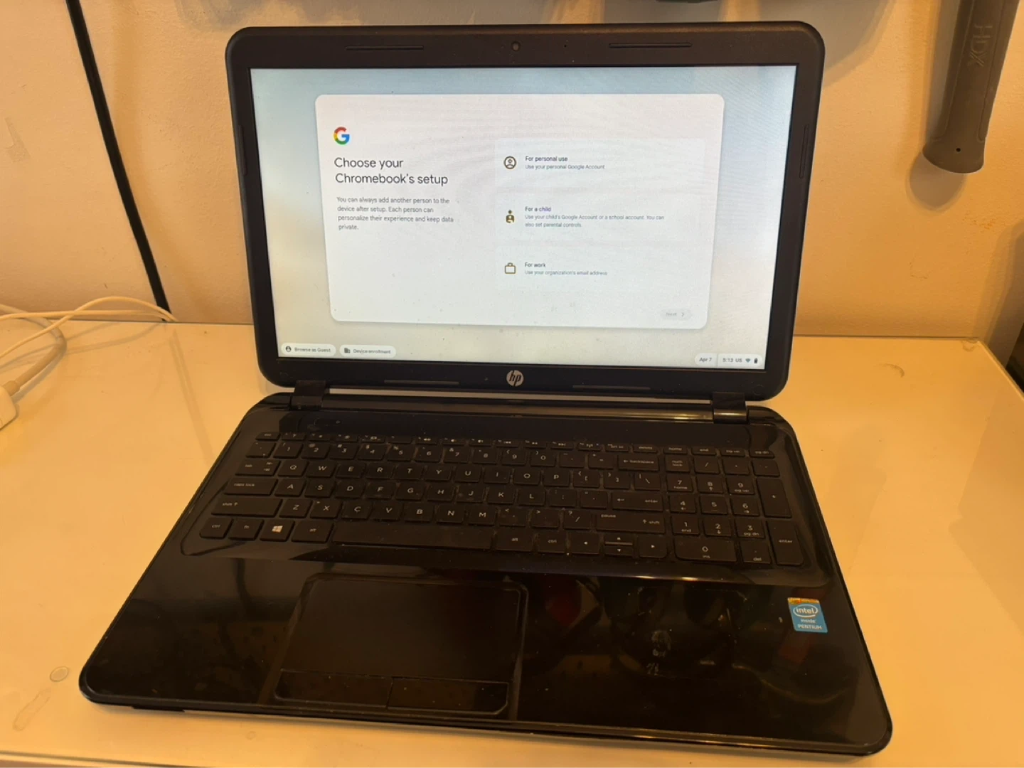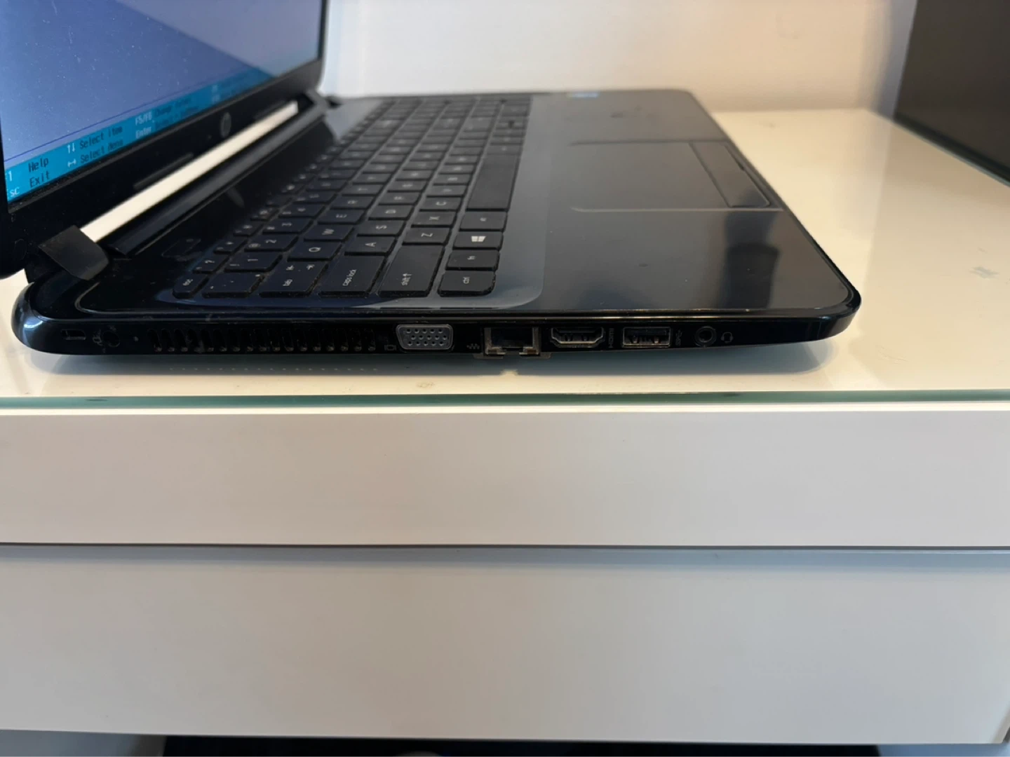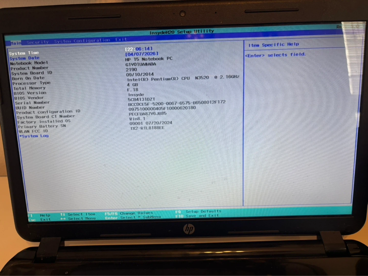 HP 15 Notebook PC with Intel Pentium processor. It has 4 GB RAM and a DVD drive. Manufactured on October 9, 2014.