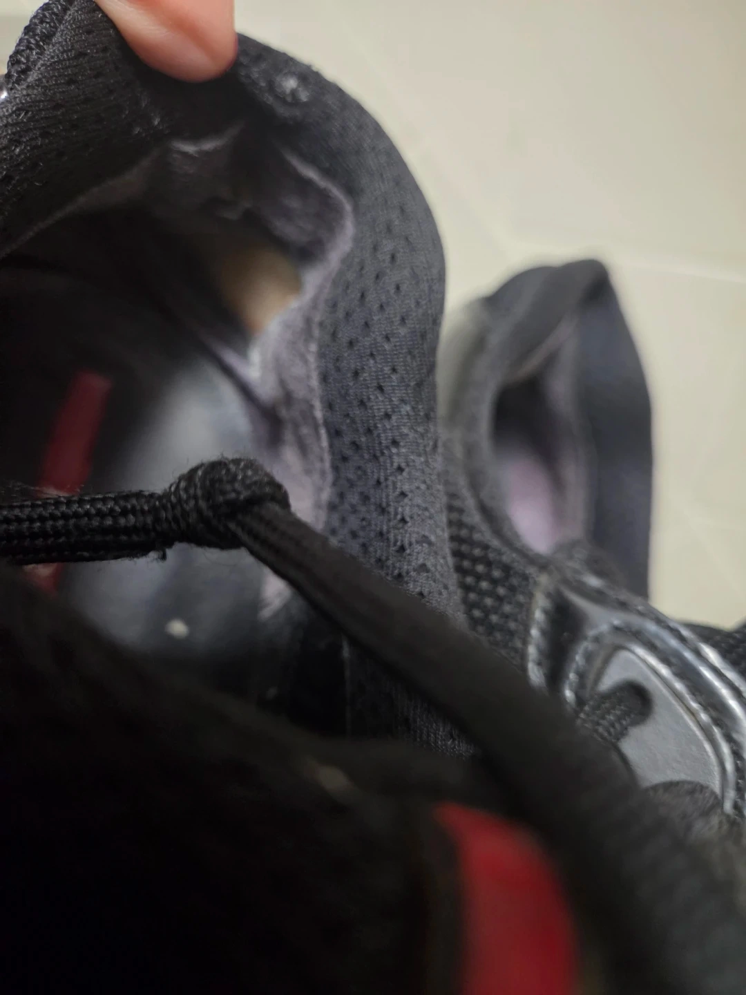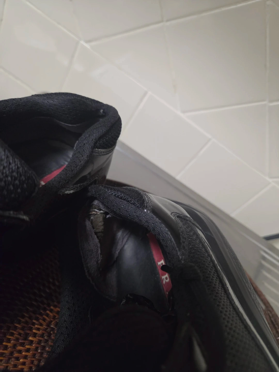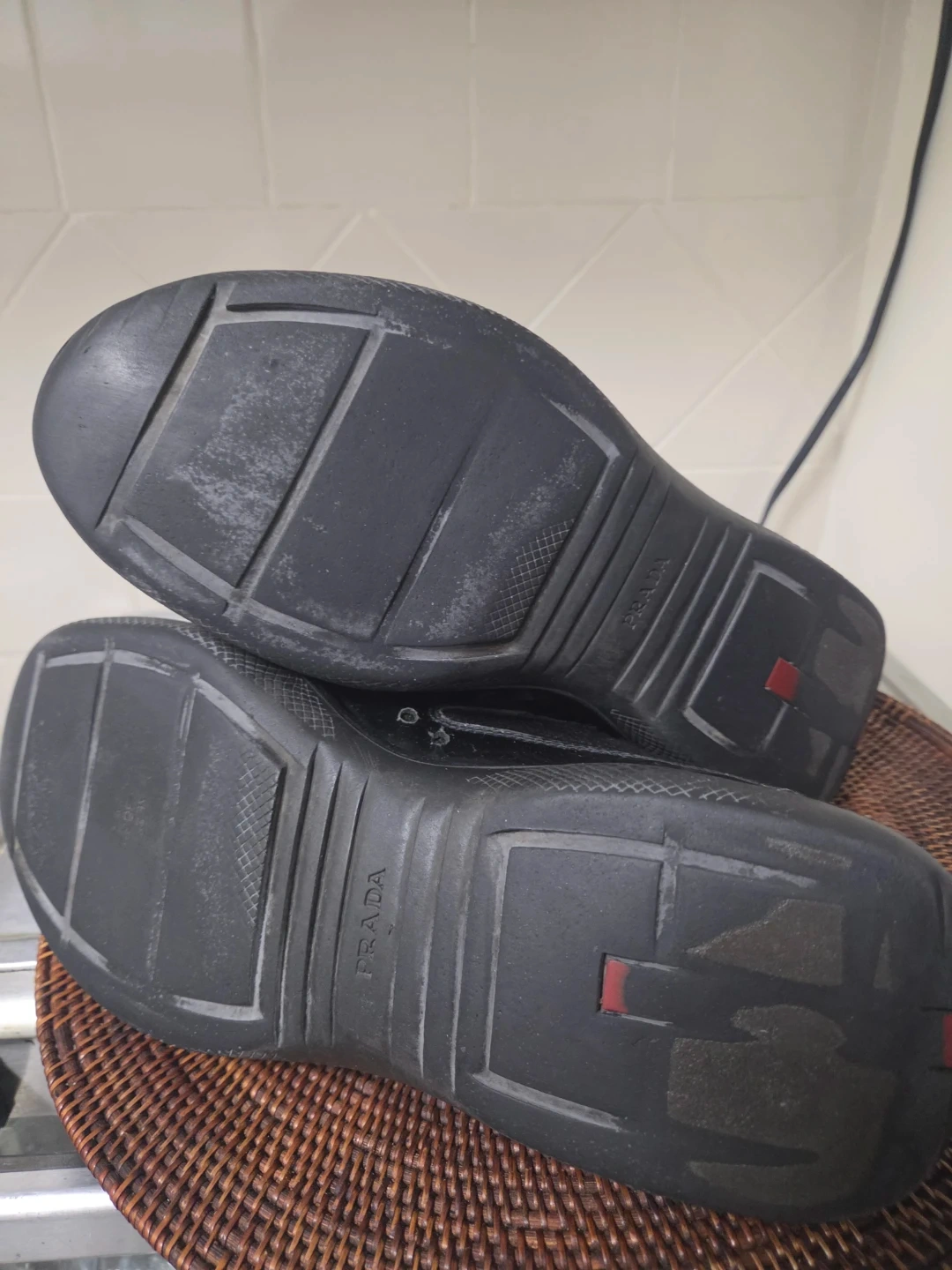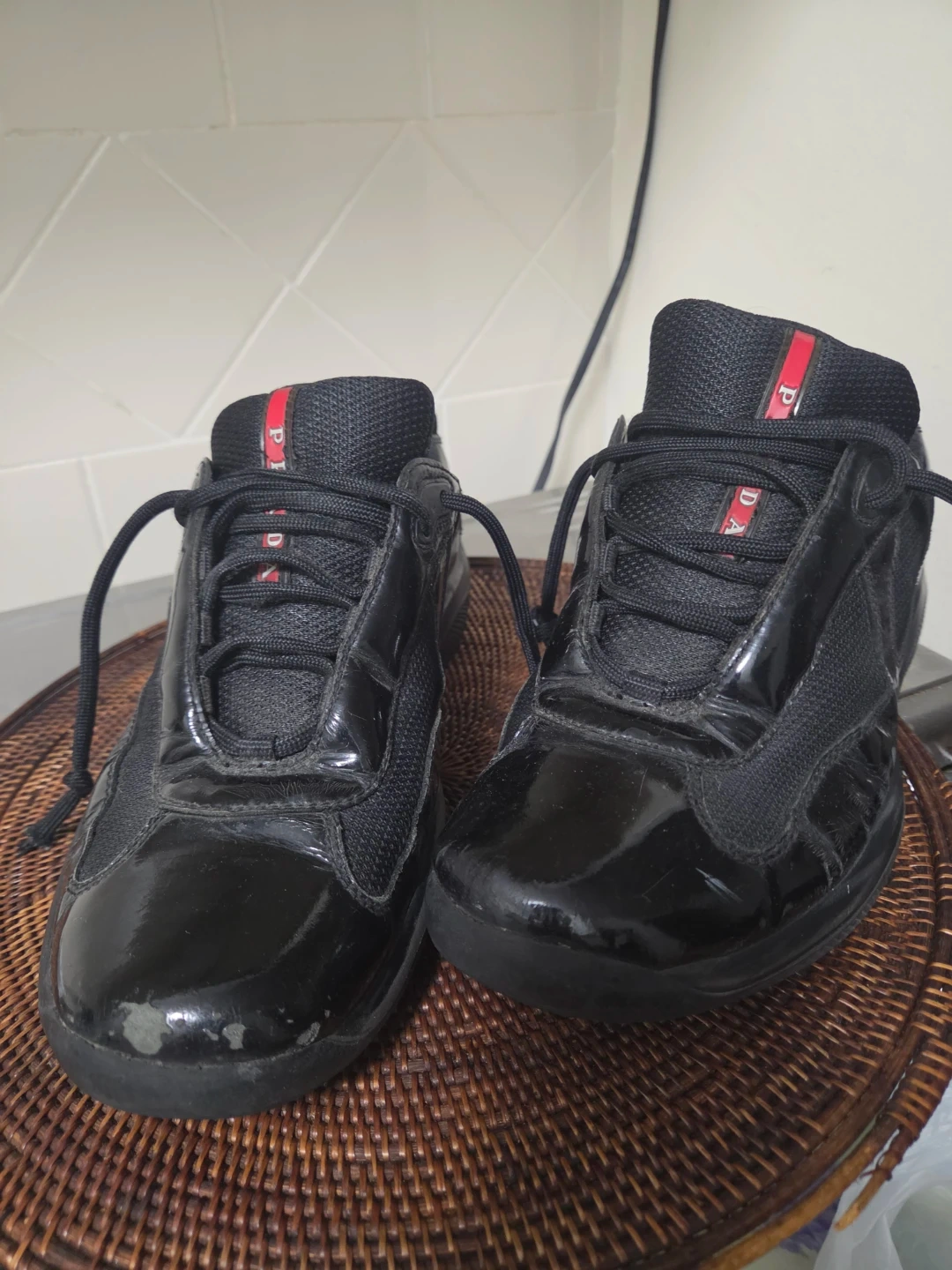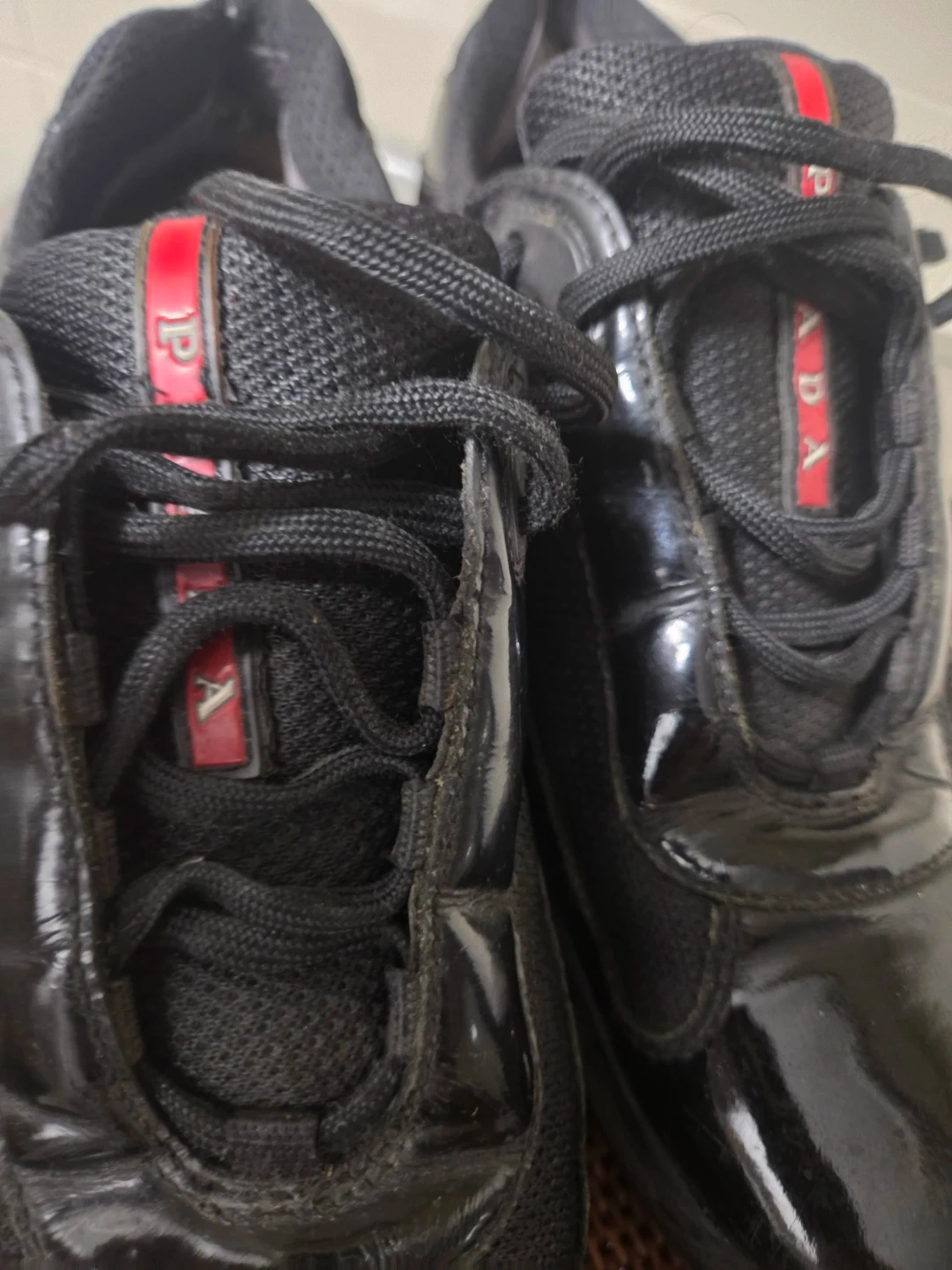 These Prada sneakers are black with a mix of patent leather and mesh uppers. They feature a lace-up closure for a secure fit. The rubber soles offer durability and traction. The iconic Prada logo is visible on the tongue and sole.