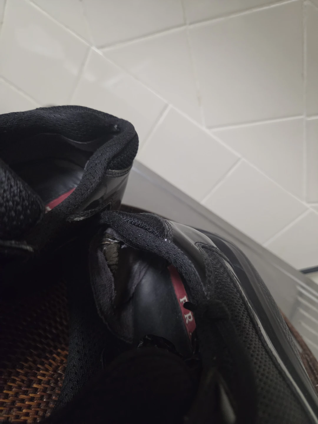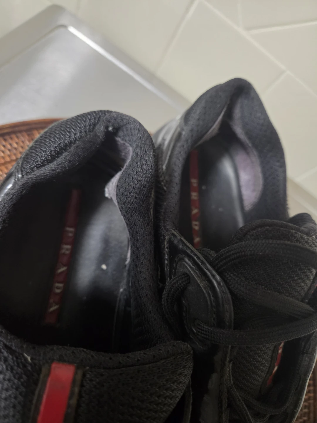 These Prada sneakers are black with a mix of patent leather and mesh uppers. They feature a lace-up closure for a secure fit. The rubber soles offer durability and traction. The iconic Prada logo is visible on the tongue and sole.