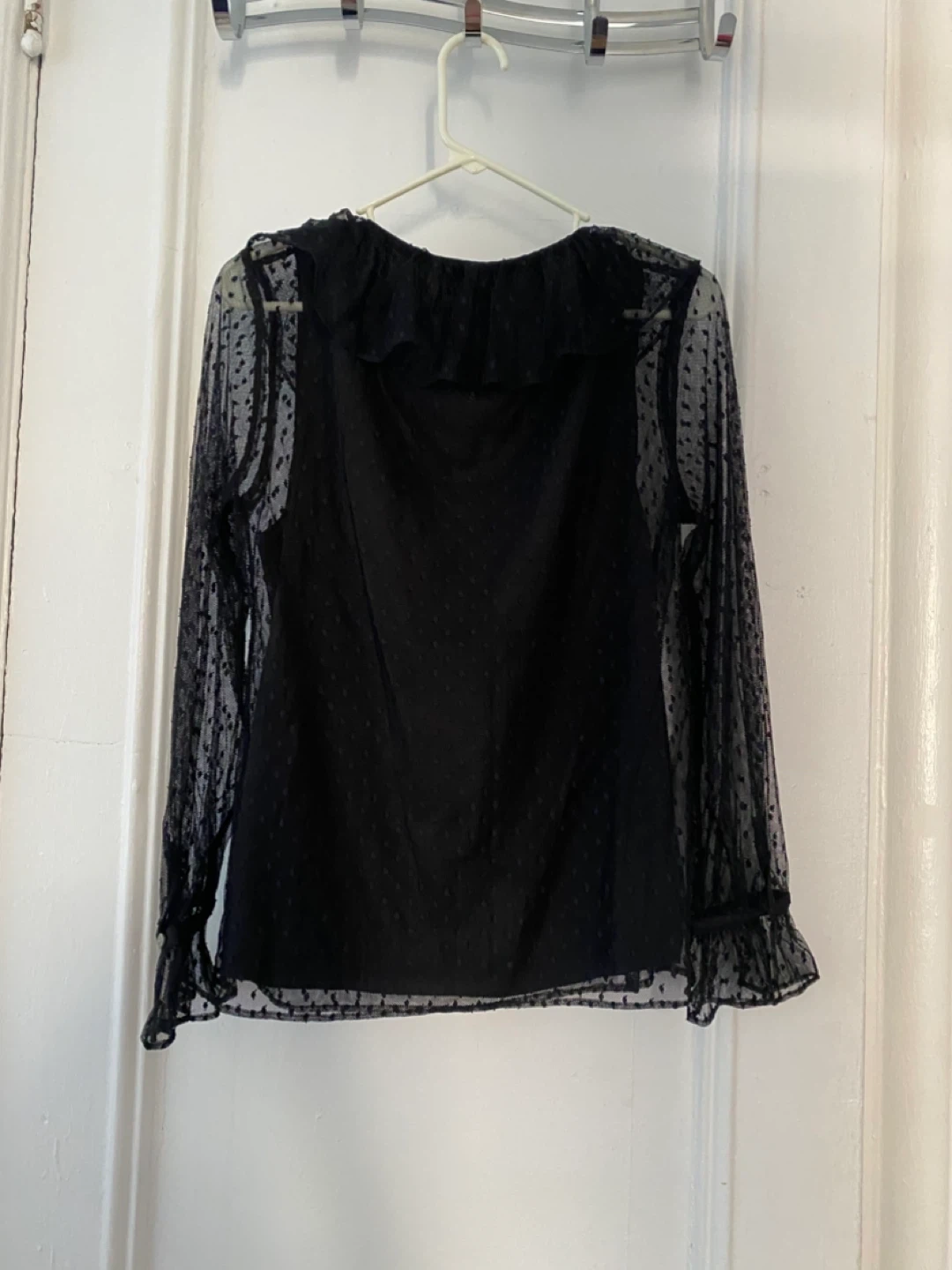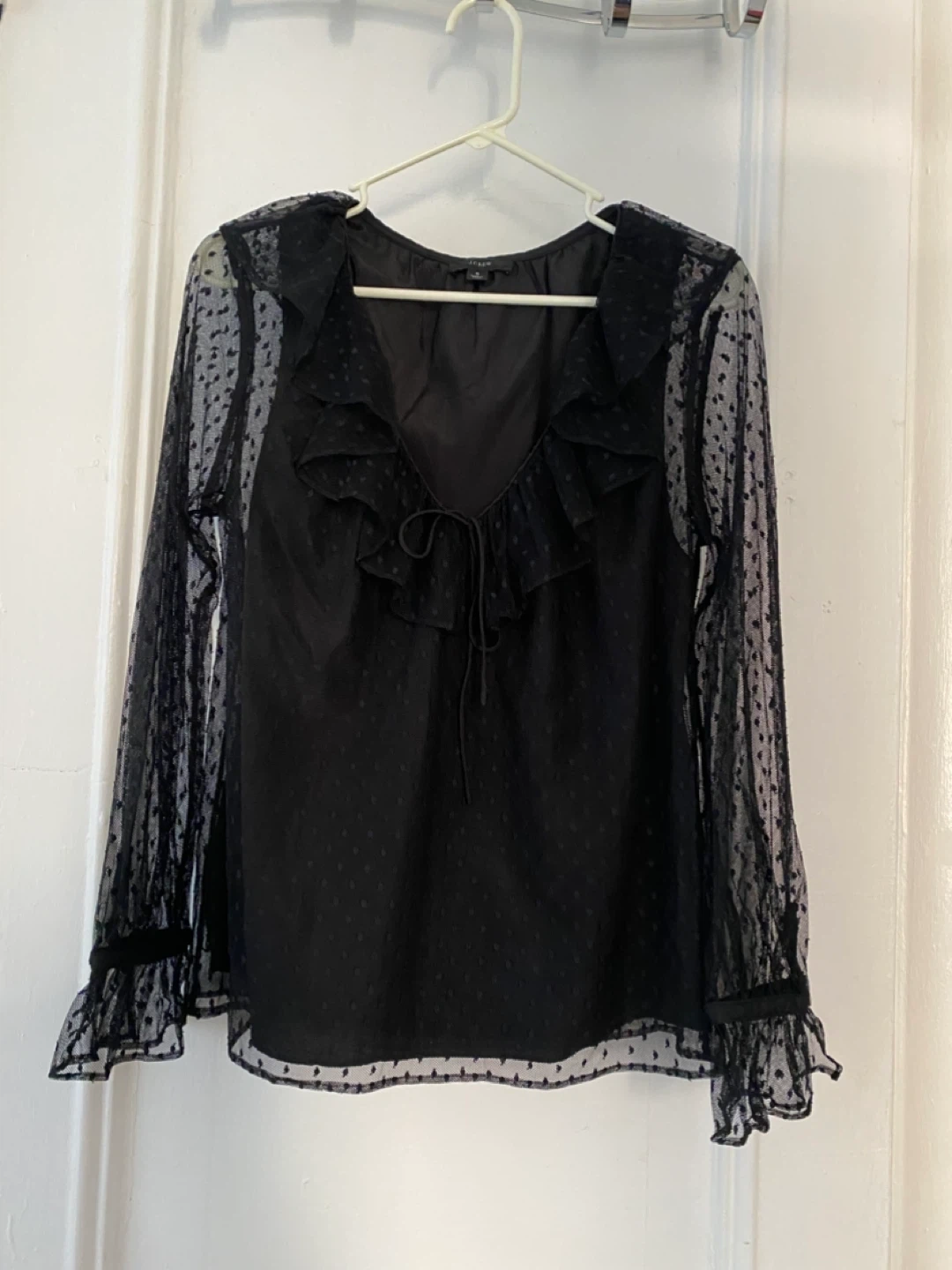 Selling a cute J. Crew blouse! It's a sheer, long-sleeved top with a delicate dot pattern. The blouse is black and size small. Perfect for dressing up or down!