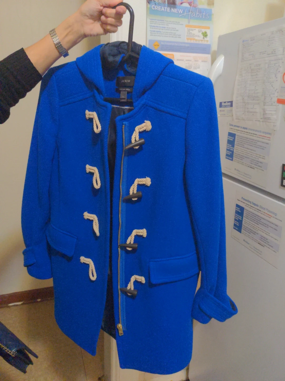 10Selling a J.Crew blue wool duffle coat! It's in great condition and ready for a new home. The coat is made of wool and features the classic duffle coat design with toggle closures and a hood. Perfect for staying warm and stylish during the colder months