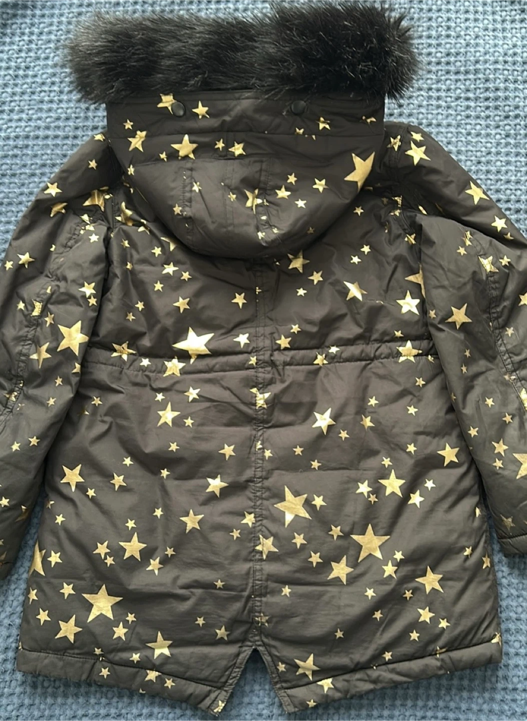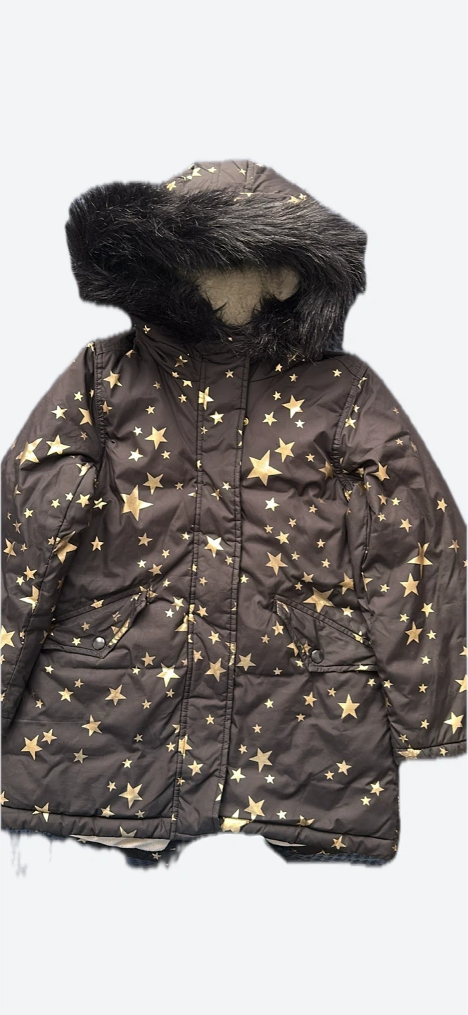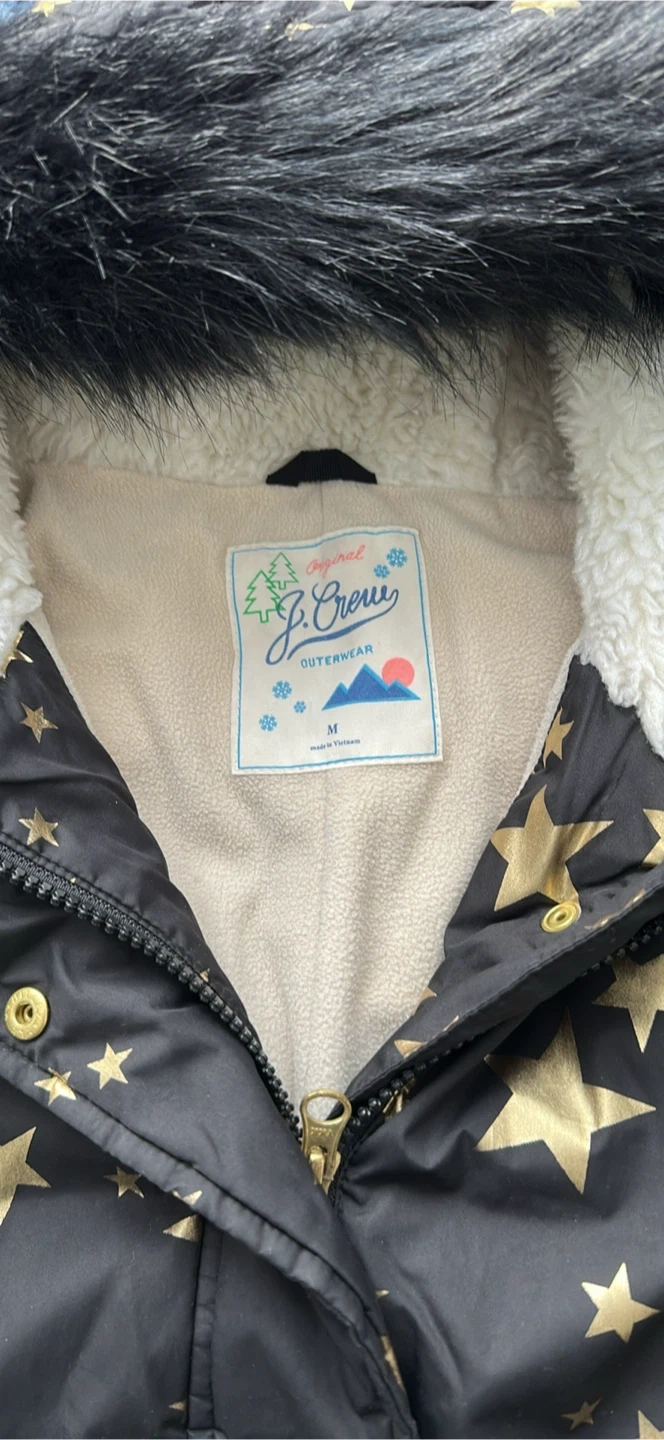 Here's a J.Crew girls' outerwear jacket, size medium! It's a stylish jacket with a cool star pattern and a faux fur-trimmed hood. Perfect for keeping warm and looking great!