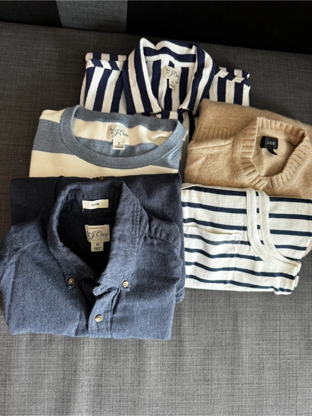 Selling a bundle of J.Crew men's clothing. Includes a variety of shirts and sweaters in different styles all size small. Perfect for updating your wardrobe!