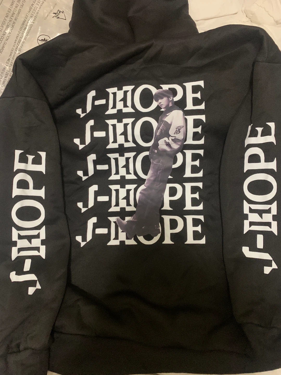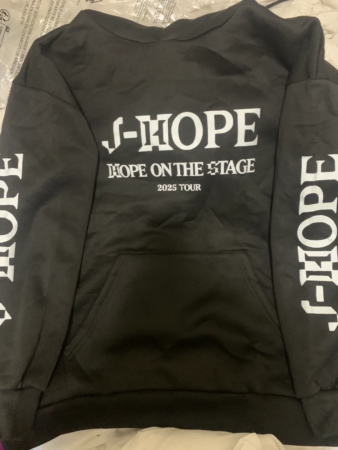Selling a J-Hope hoodie from the 'Hope on the Stage' 2025 Tour! Size:L It's black with white lettering and graphics of J-Hope. The sleeves also have 'J-Hope' printed on them. This is a must-have for any fan!