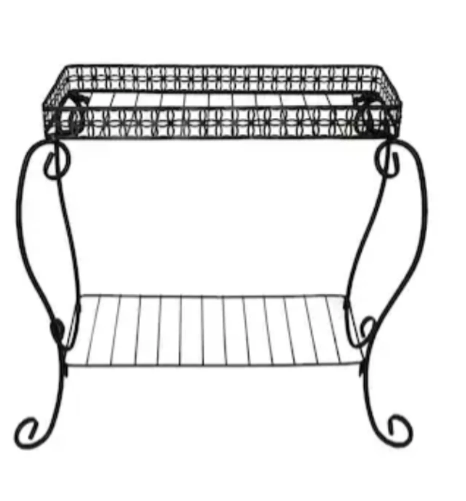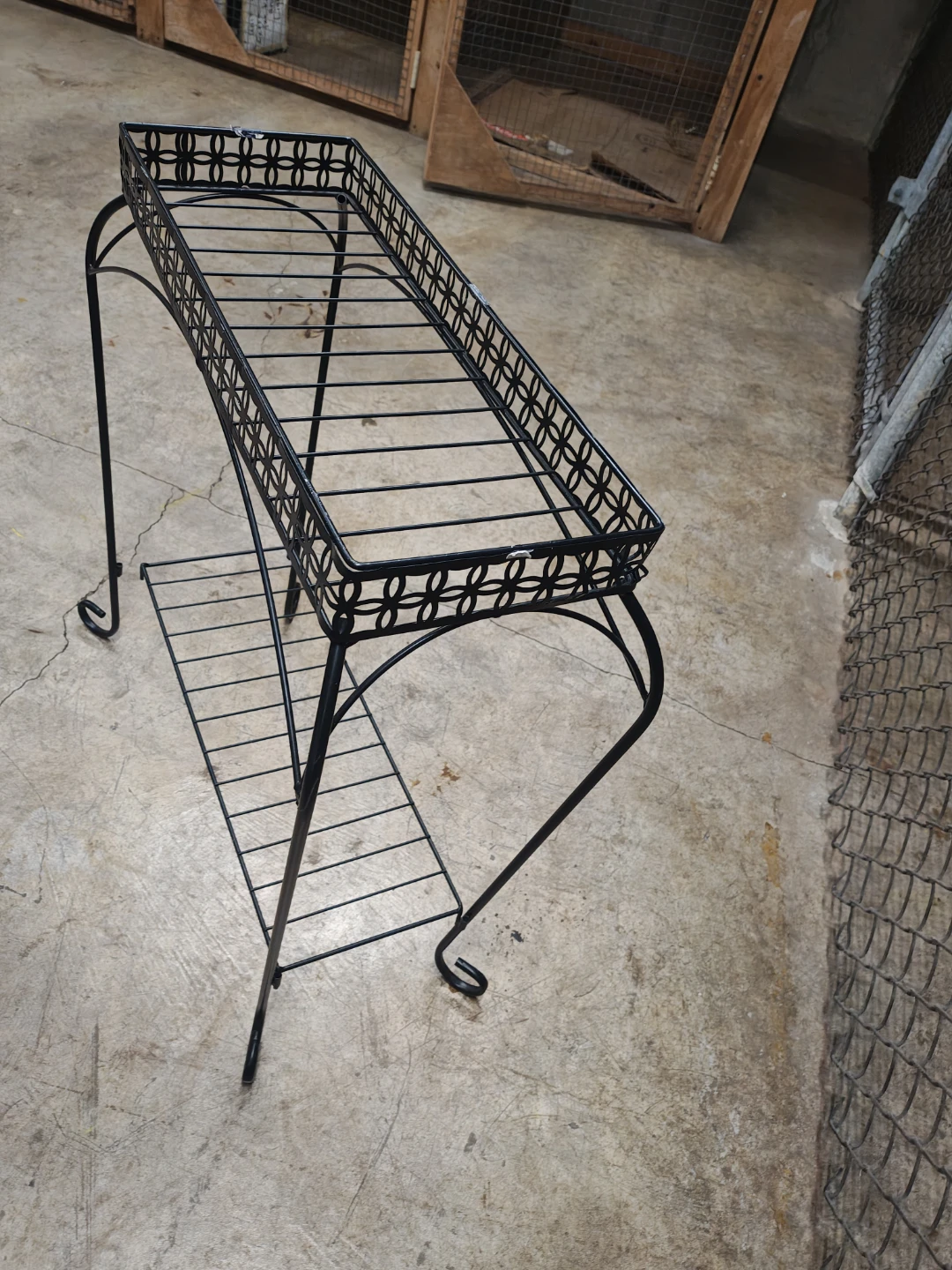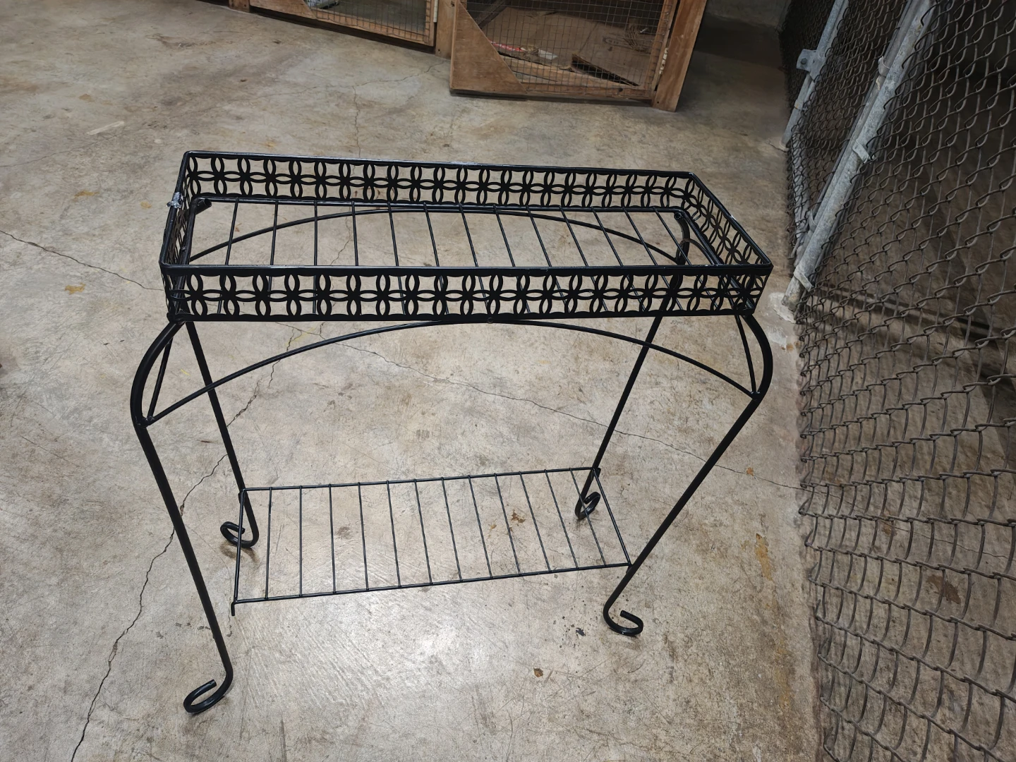 This is an Allen & Roth black indoor/outdoor rectangular steel plant stand with two shelves. It features decorative scrollwork on the edges of the top shelf. The stand has a curved leg design. It's suitable for displaying plants or other decor. Never been used, new. Price is negotiable.