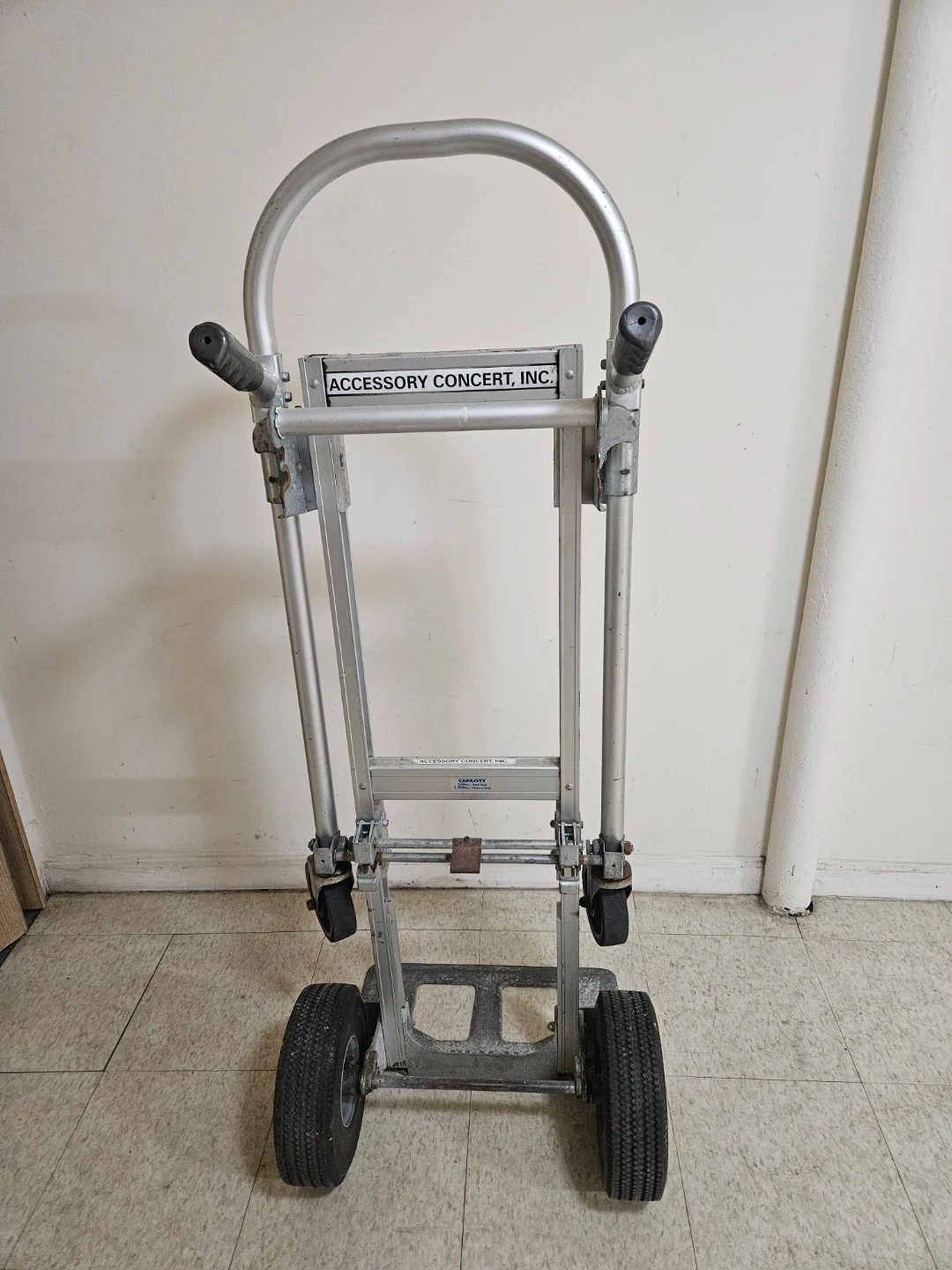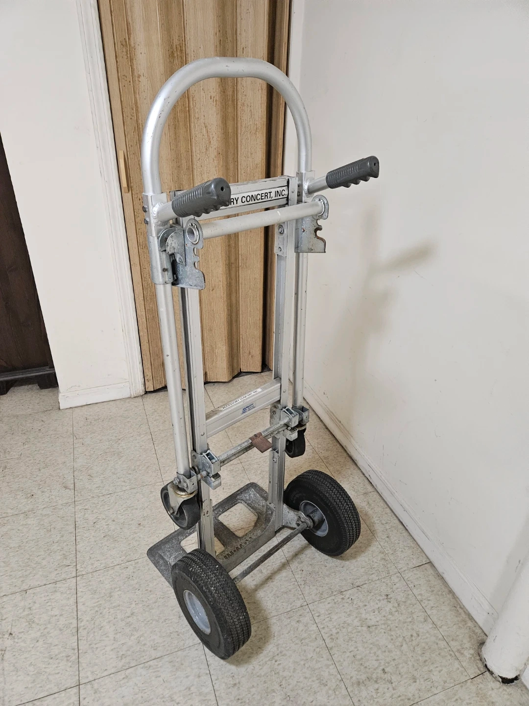 This aluminum hand truck dolly cart is designed for moving heavy loads. It features a sturdy frame and two large wheels for easy maneuverability. The handles provide a comfortable grip for pushing and pulling. It's great for moving boxes or equipment around your home or workplace.