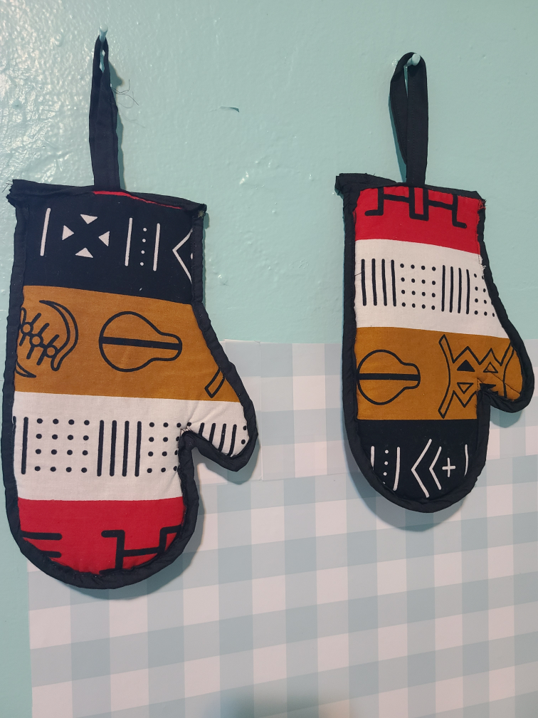 I'm selling a set of two handmade oven mitts! They feature a unique design with black, white, red, and gold colors. Perfect for adding a touch of style to your kitchen!