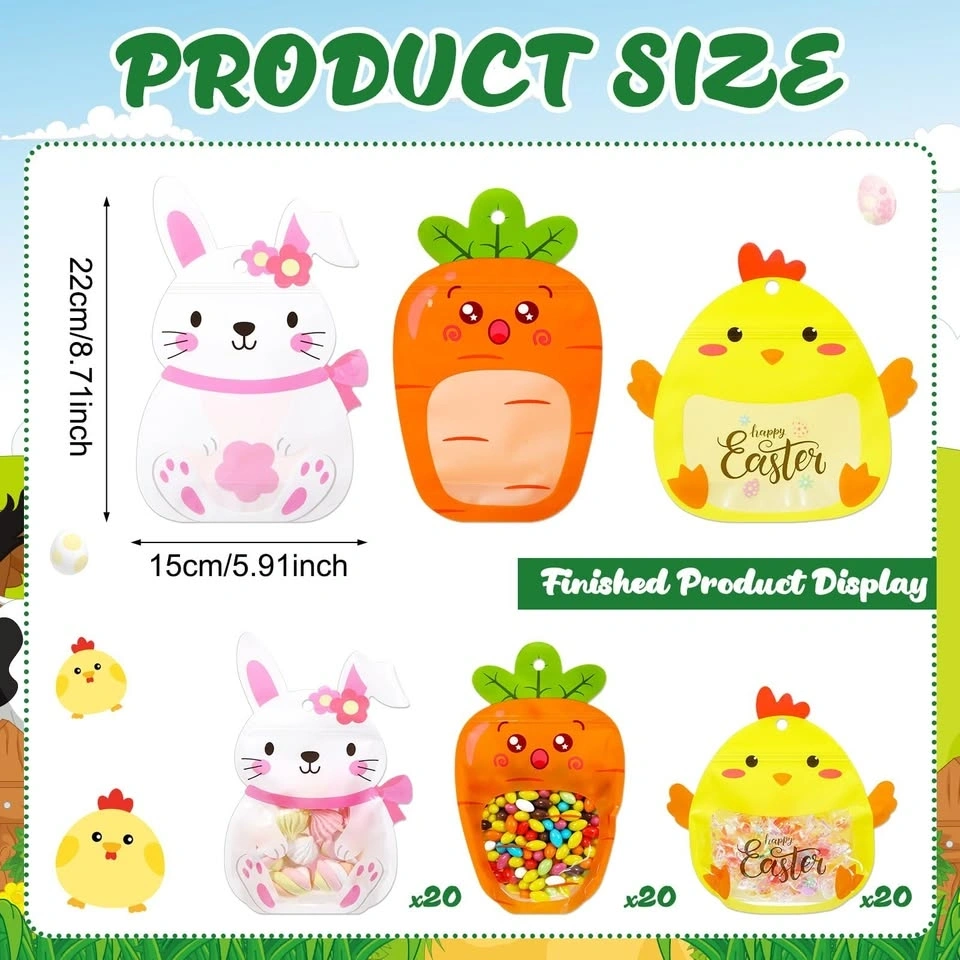 Cute Easter treat bags! You get 60 bags total, 20 each of the bunny, carrot, and chick designs. Perfect for filling with candy or small toys for Easter baskets or parties. Each bag is about 22cm/8.71inch tall and 15cm/5.91inch wide. New, never used.