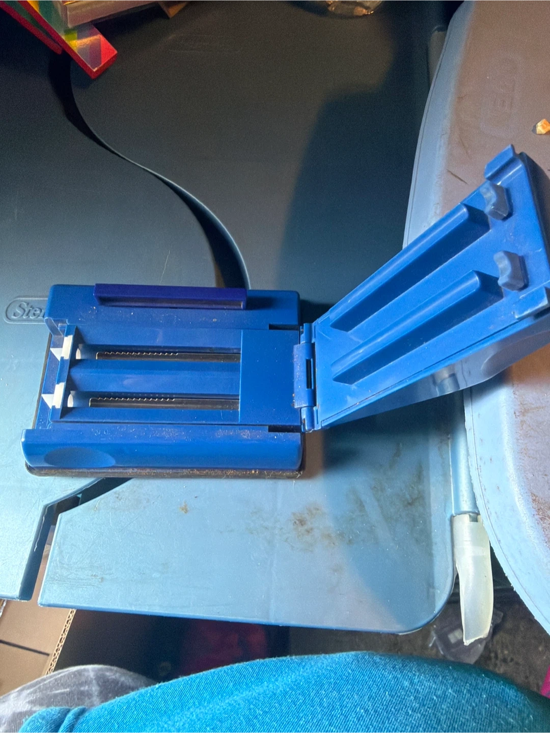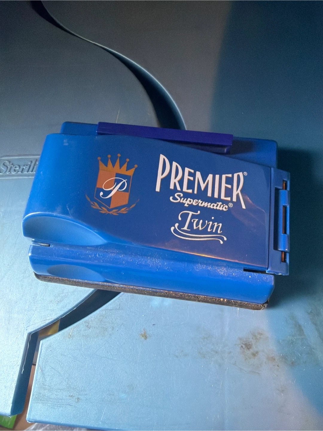 This is a Premier Supermatic Twin cigarette rolling machine. It's blue and made of plastic. It's designed for making two cigarettes at a time.