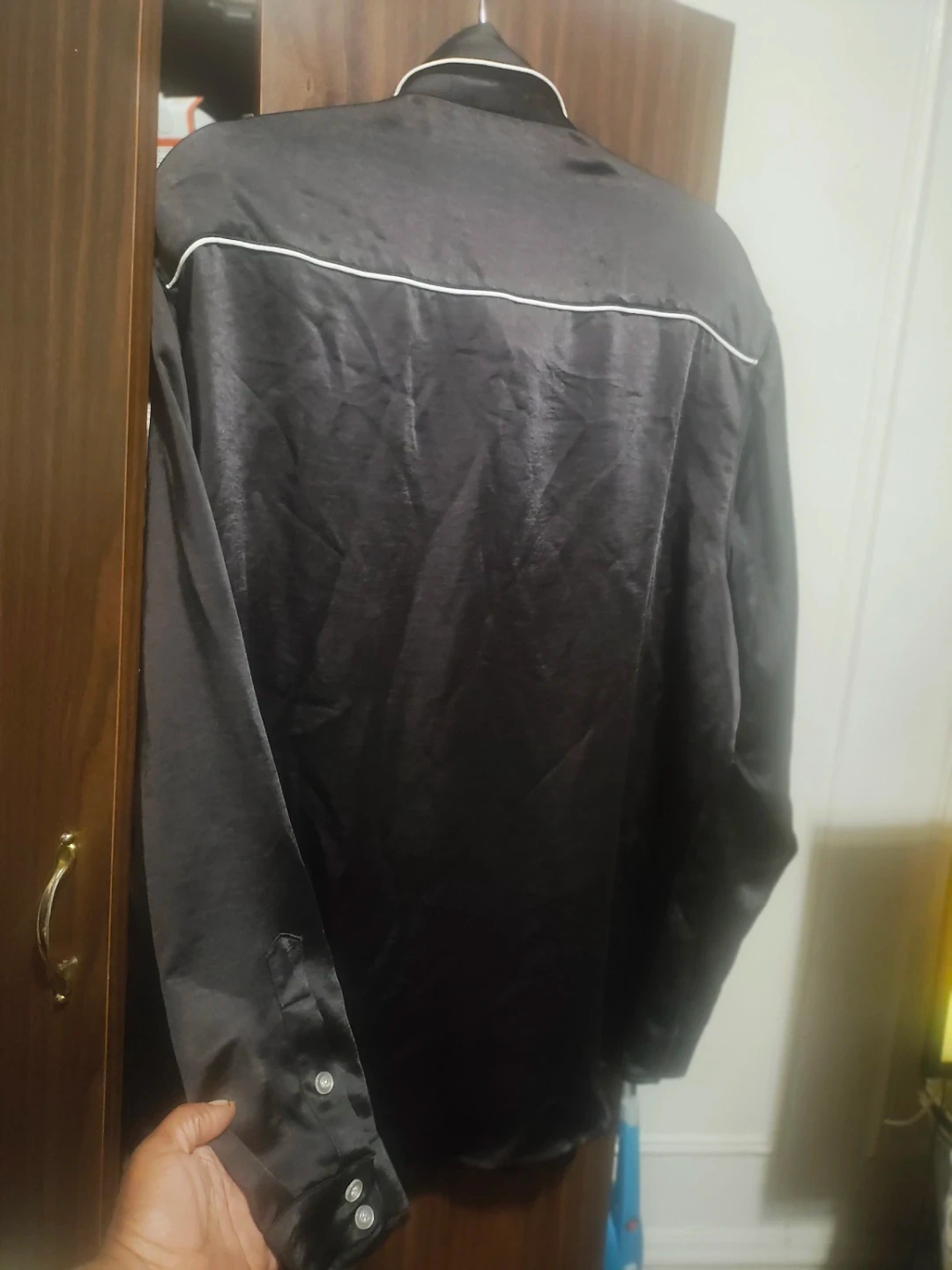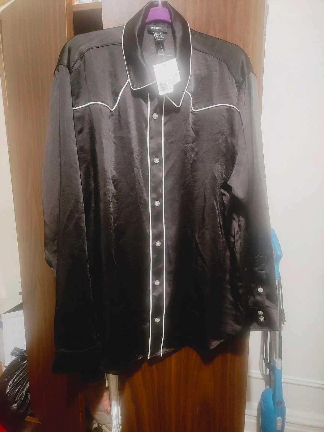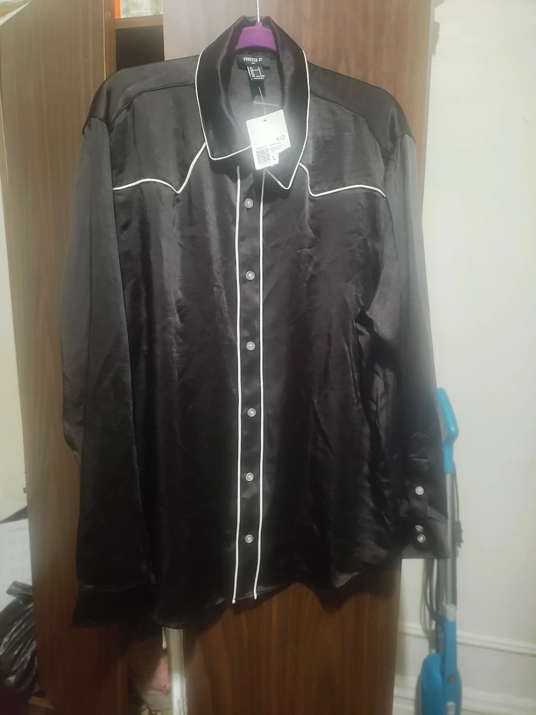 This is a black satin western-style shirt from Forever 21 Men. It's size Large. The shirt has white piping details.