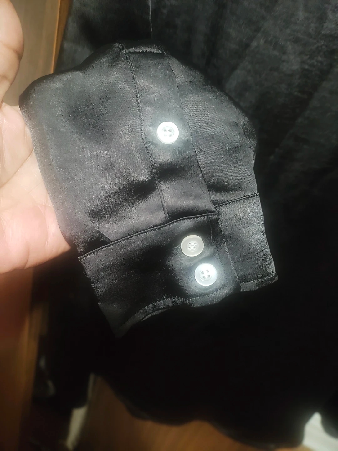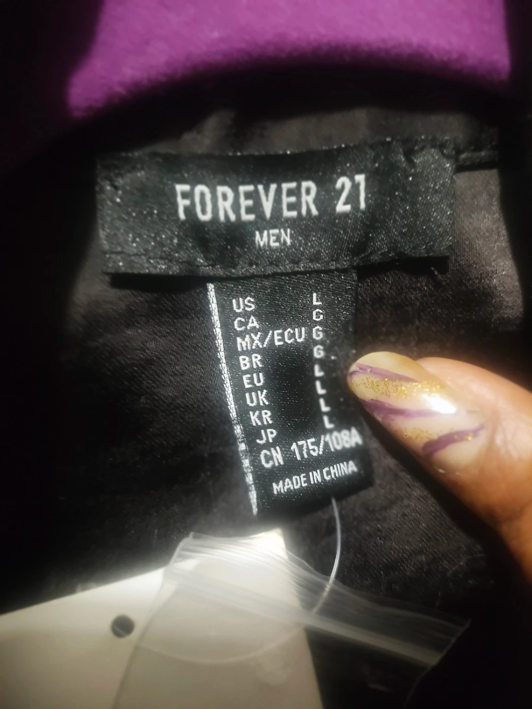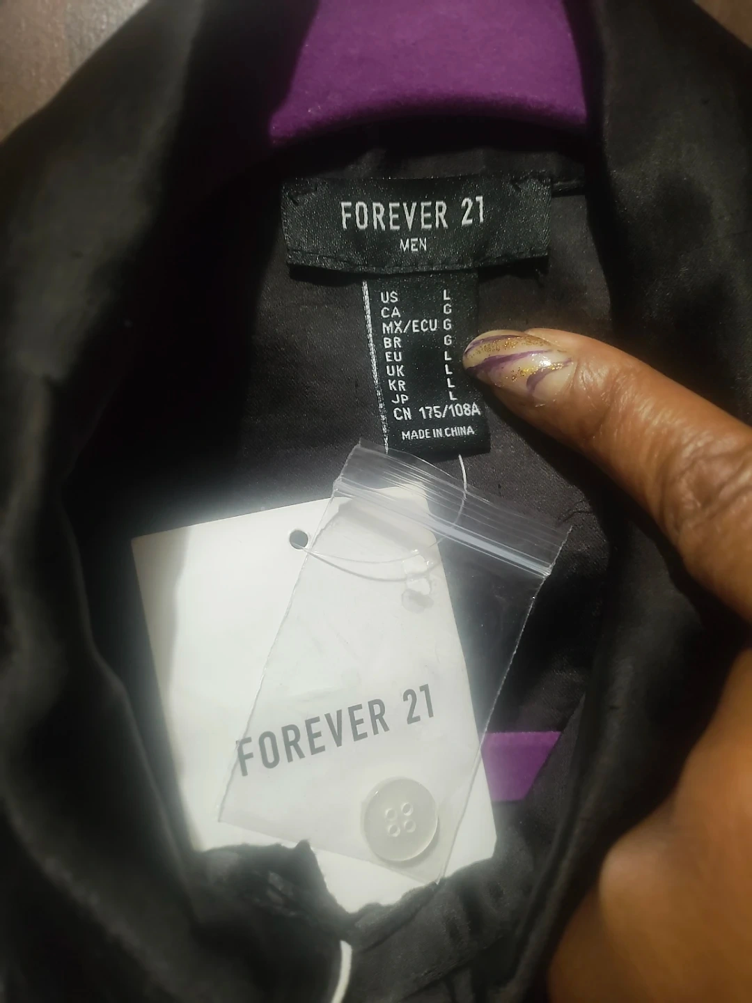 This is a black satin western-style shirt from Forever 21 Men. It's size Large. The shirt has white piping details.