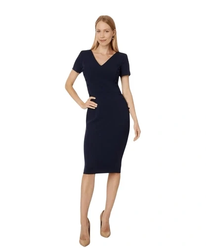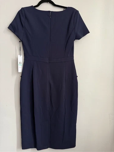 New with tags. Sheath silhouette. V-neckline and short sleeves. Zippered center back closure. Decorative button detail. Back slit. Intended to hit the knee. 96% polyester, 4% spandex. Dry-clean only.
