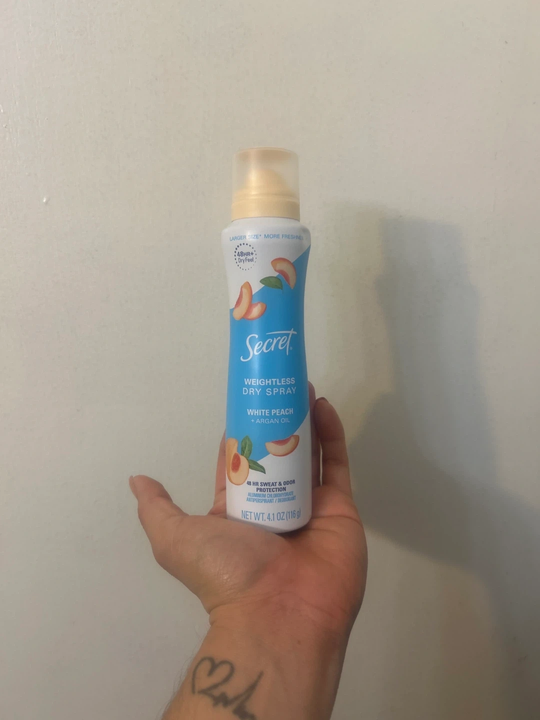 Selling a Secret Weightless Dry Spray in White Peach + Argan Oil scent. It's a 4.1 oz (116 g) bottle. Perfect for everyday use and keeps you feeling fresh!