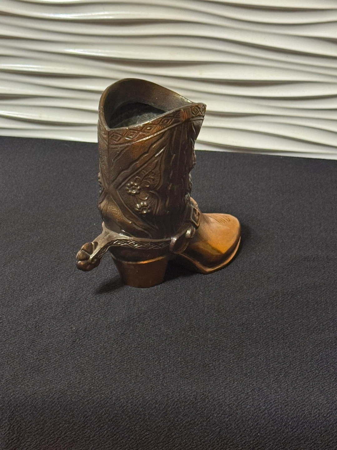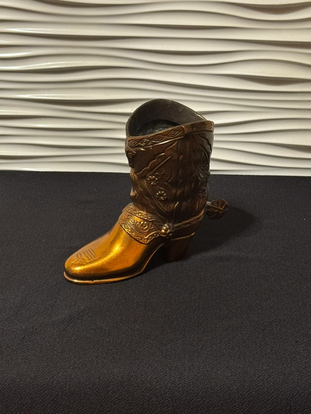 A vintage metal cowboy boot figurine. It has a bronze/gold color and intricate designs etched into the metal. It measures approximately 5 inches in length. This would make a great decor piece!