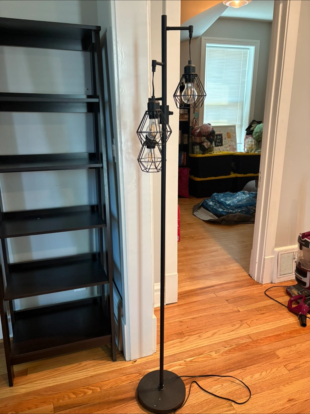 Industrial style lame Tall black floor lamp. Three cage style shades. Great condition. Lightbulbs included hardly used