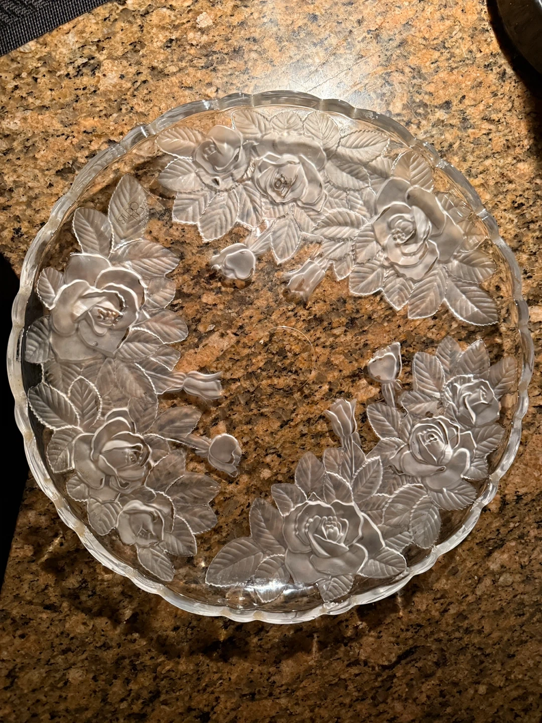 Studio Nova Winter Rose glass serving platter, a discontinued vintage piece produced in Japan 🇯🇵 featuring a clear glass base with a frosted rose pattern.
