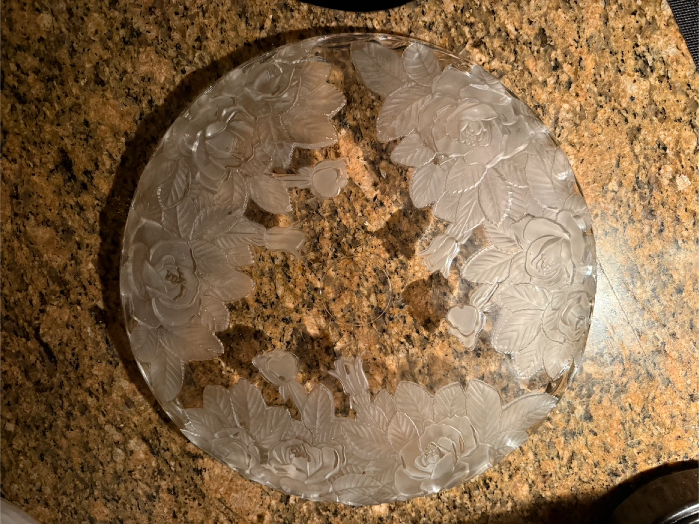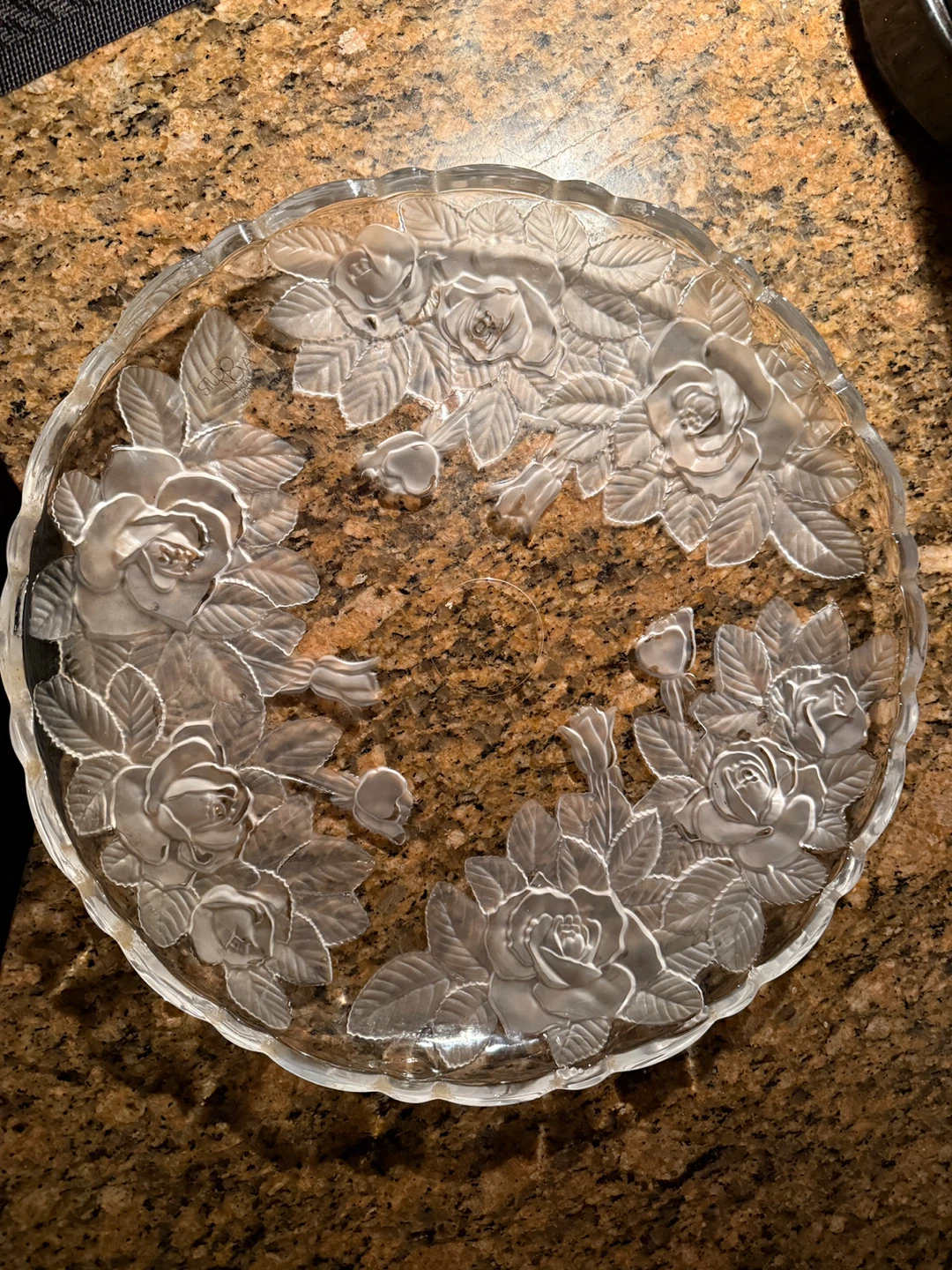 Studio Nova Winter Rose glass serving platter, a discontinued vintage piece produced in Japan 🇯🇵 featuring a clear glass base with a frosted rose pattern.