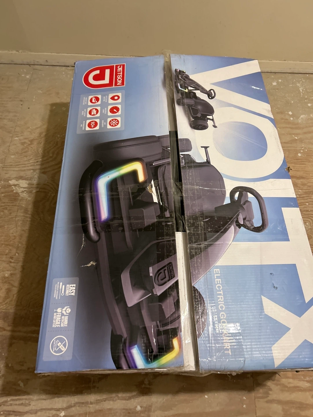 New Jetson electric go-kart in original packaging. Features LED lights and easy assembly. Includes steering wheel and throttle for a fun ride!