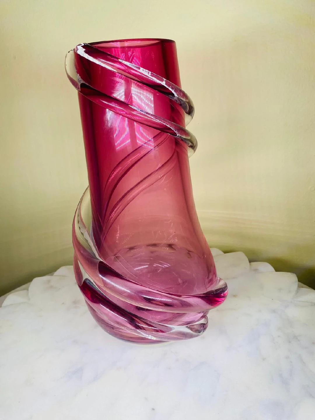 Here's a beautiful pink glass vase with a clear swirl design! It's in great condition and would look lovely as a decorative piece in any room. The vase stands approximately 10 inches tall and weight 6.5lb