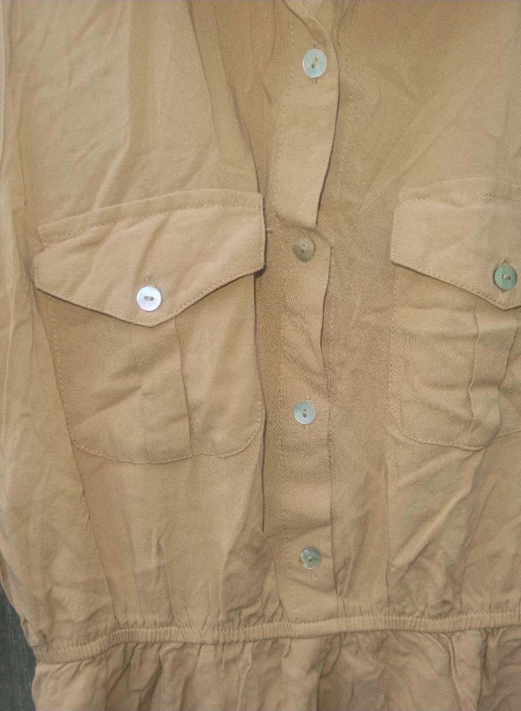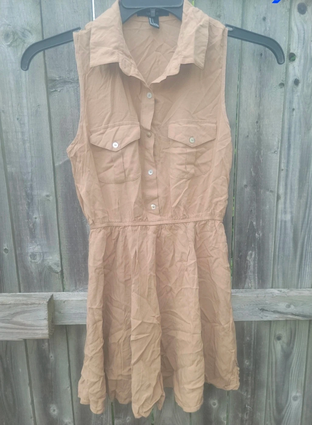 This sleeveless shirt dress from Forever 21 features a tan color and button-up front with dual chest pockets. It has a collared neckline and an elasticized waist. It's a simple and casual piece for everyday wear.