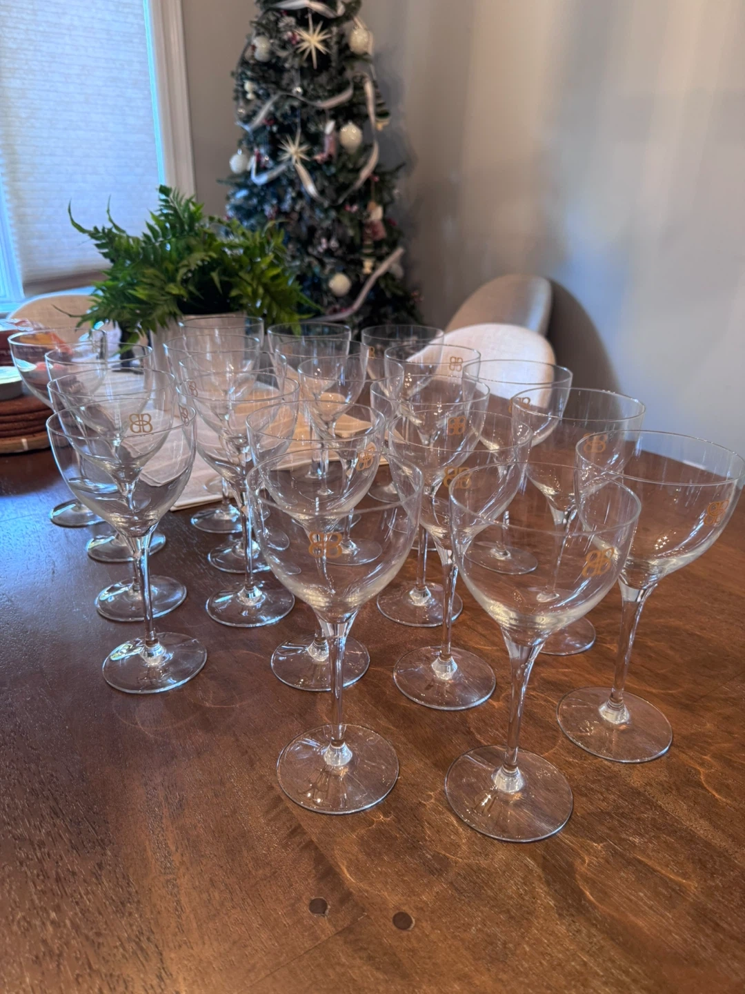 This is a set of 12 crystal wine glasses. They feature a delicate etched logo on each bowl. These glasses are perfect for serving wine or other beverages at gatherings.