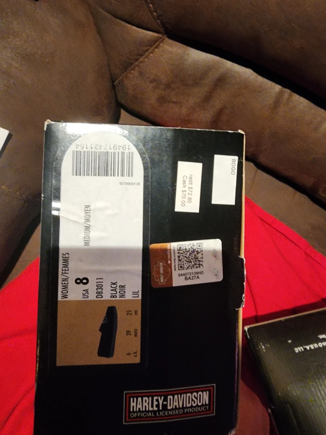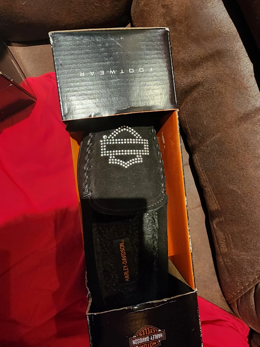 Women's Harley-Davidson moccasins in black. Size 8 USA (6 UK, 39 EU). Features a decorative rhinestone logo on the front. Includes original box.