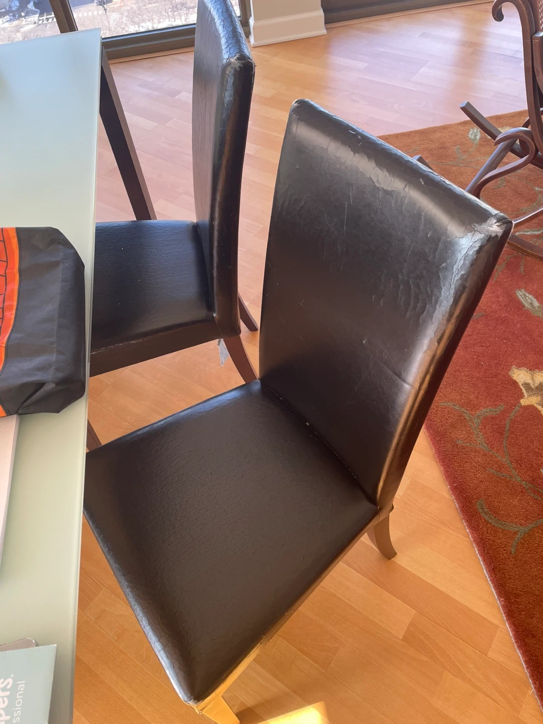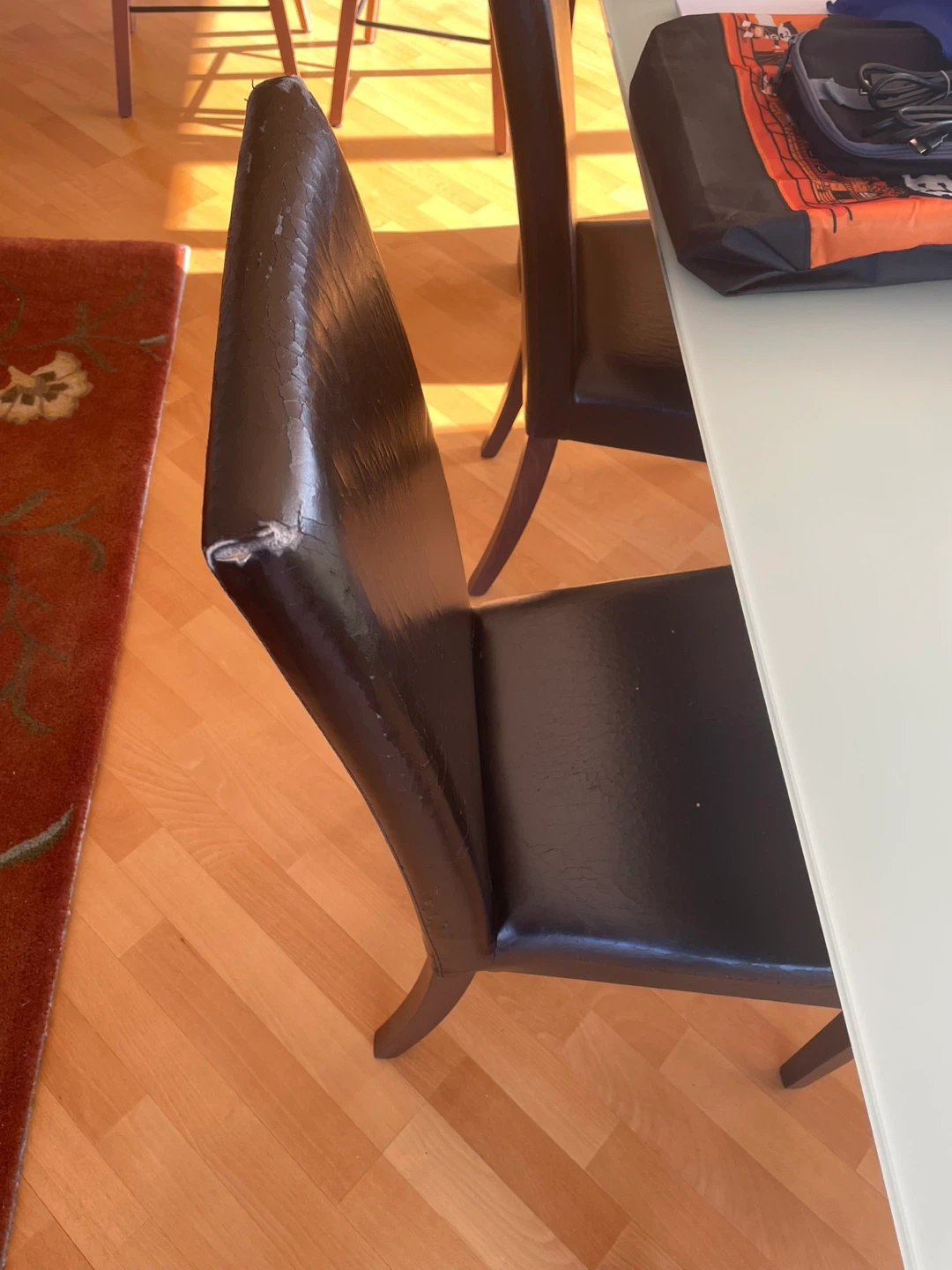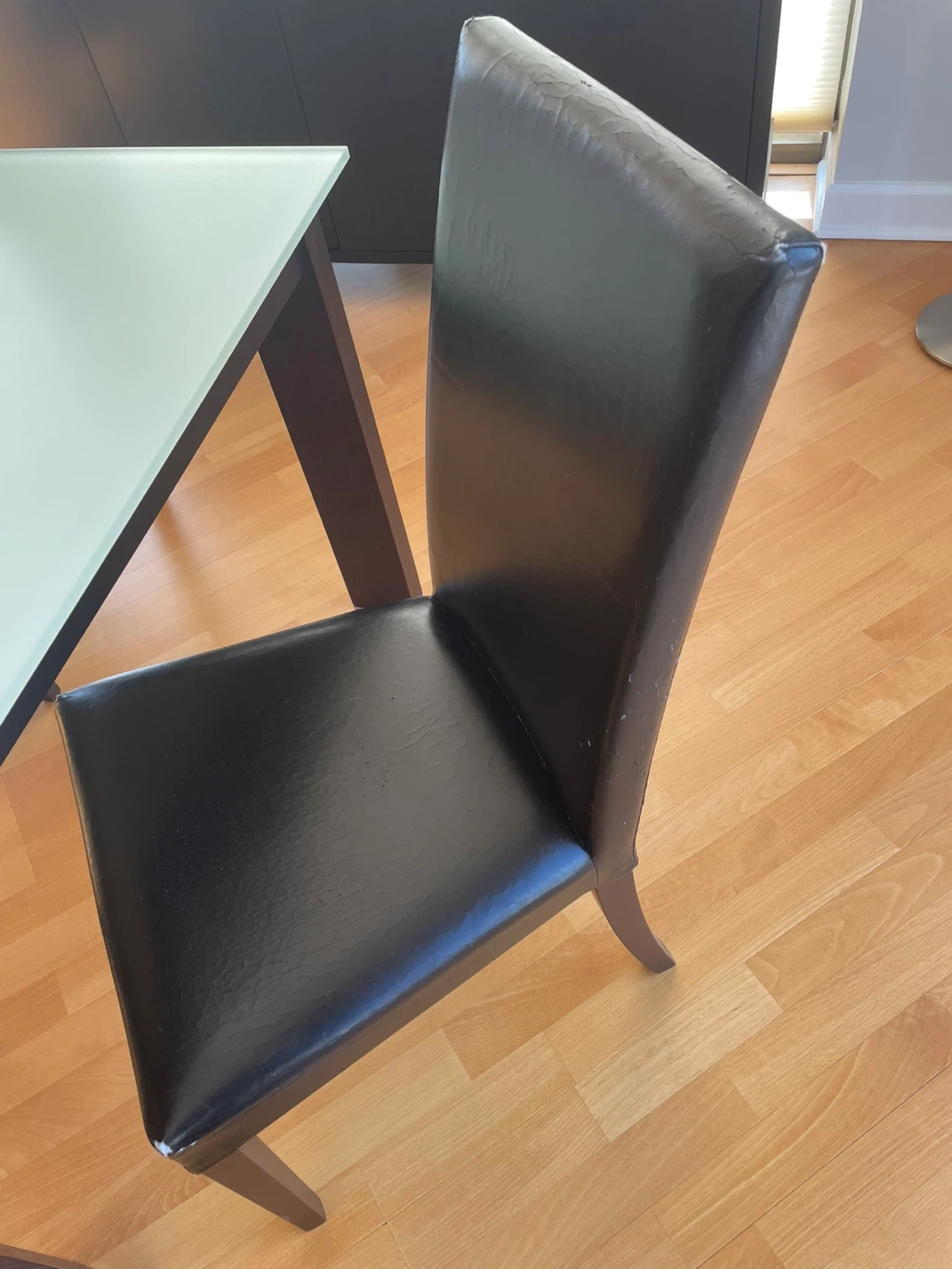 Dining chair with dark brown faux leather upholstery. Shows some wear and tear on the seat and backrest edges. Wooden legs provide a sturdy base. Comfortable for everyday use.