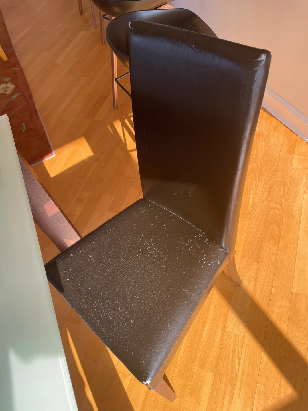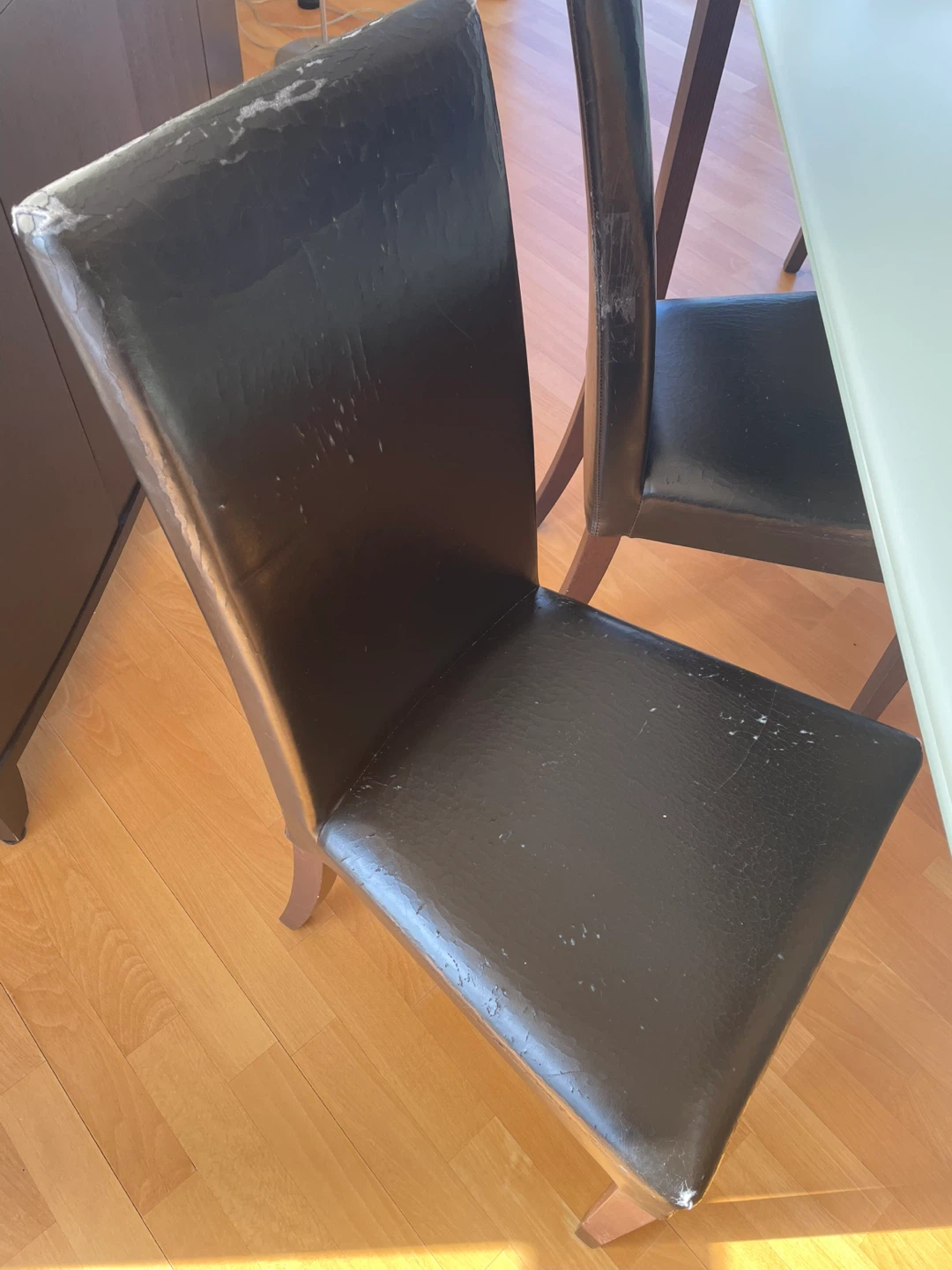 Dining chair with dark brown faux leather upholstery. Shows some wear and tear on the seat and backrest edges. Wooden legs provide a sturdy base. Comfortable for everyday use.