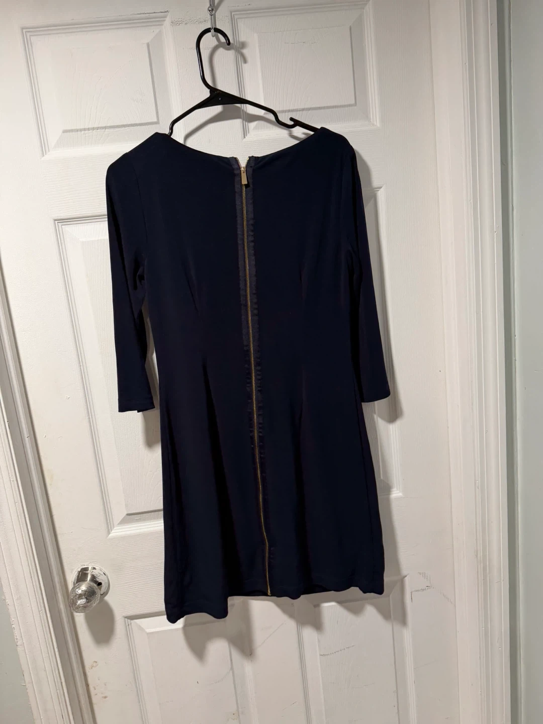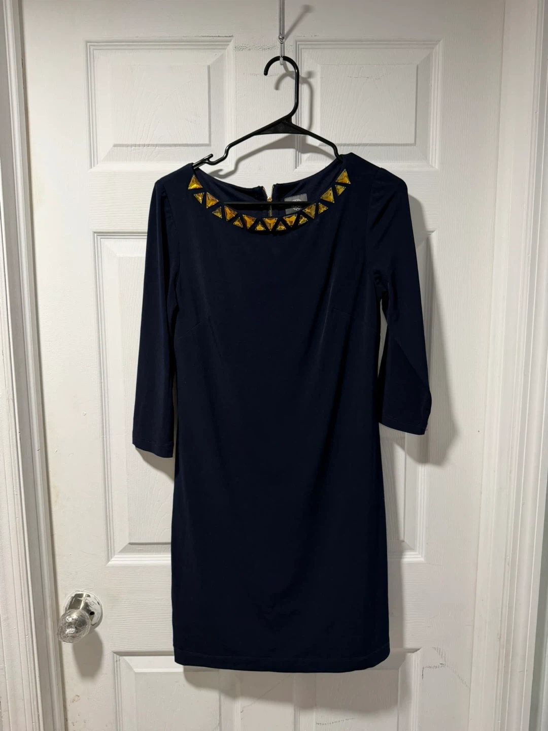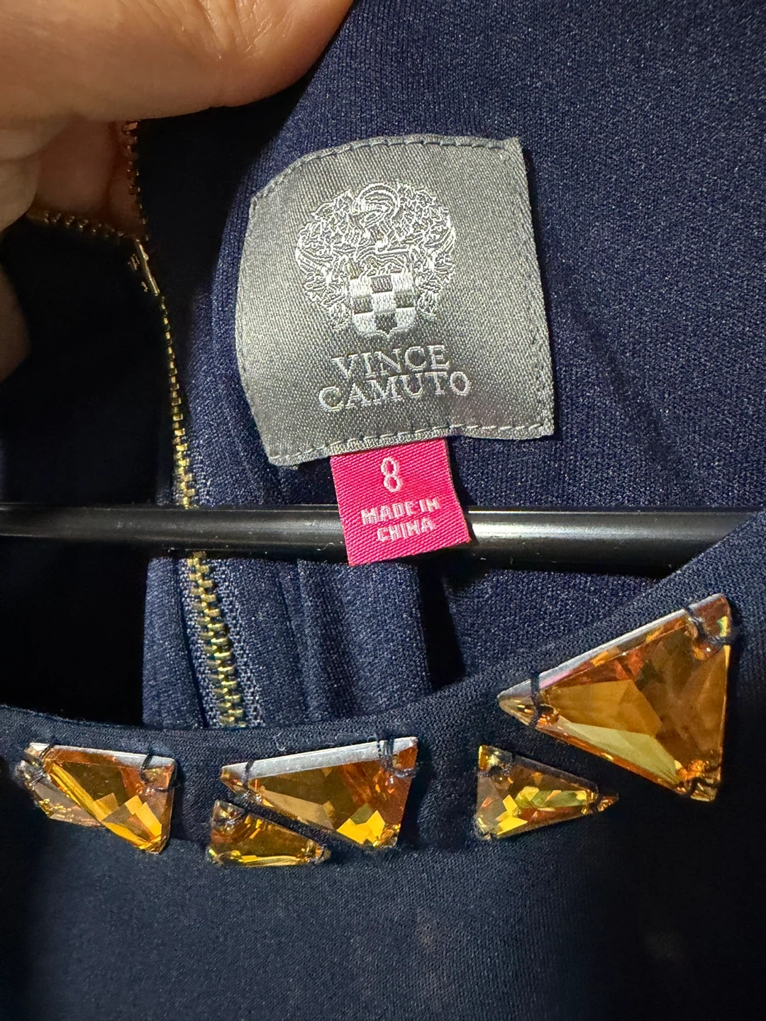 This navy blue Vince Camuto dress features a unique embellished neckline with amber-colored stones. It has a full-length zipper down the back and 3/4 length sleeves. Made in China.