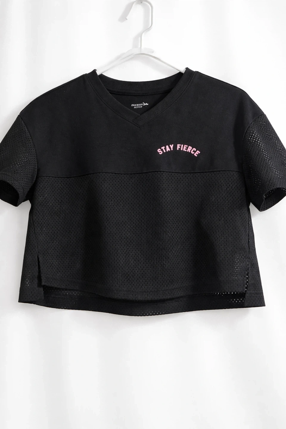 Cute Old Navy Active crop top in black! It features a V-neck and short sleeves with mesh detailing. The front has a subtle "Stay Fierce" design in pink. Perfect for workouts or casual wear