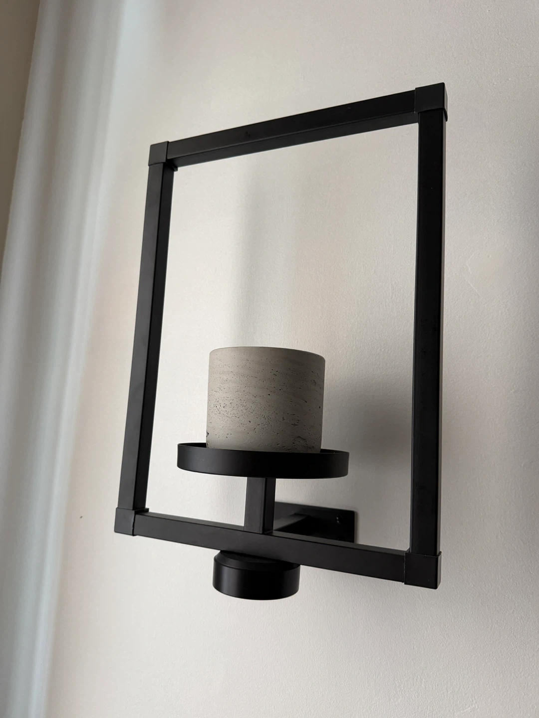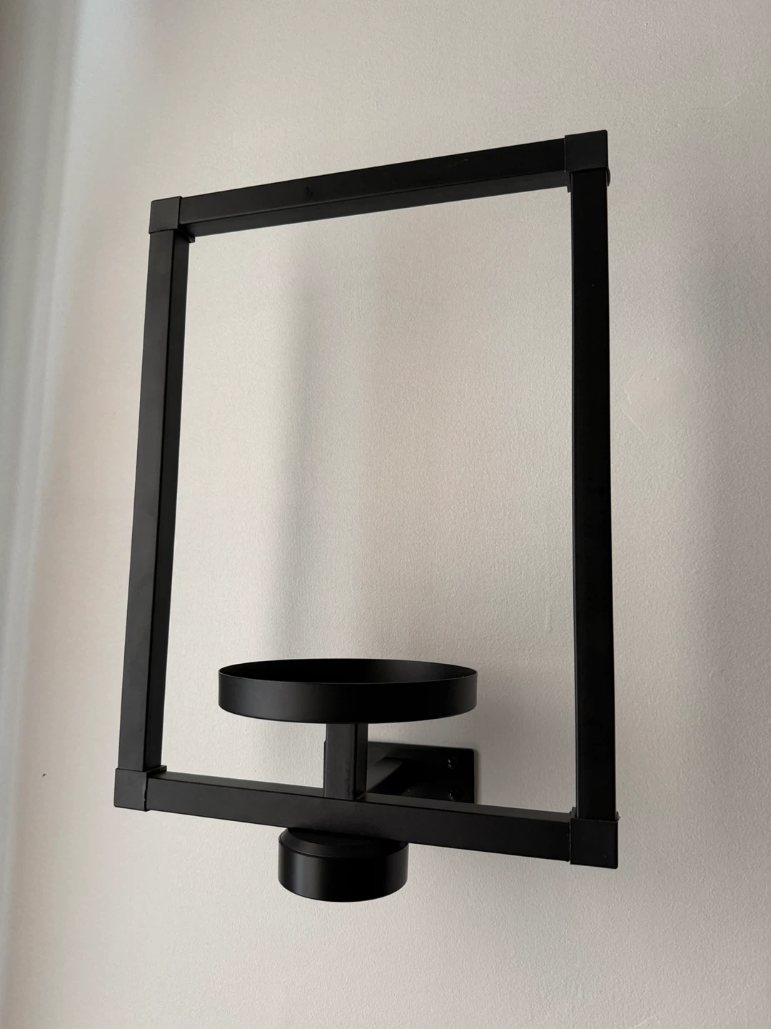 Modern wall designed for a single plant/candle. It features a black metal frame with a square outline and a central platform. Adds a contemporary touch to any room!