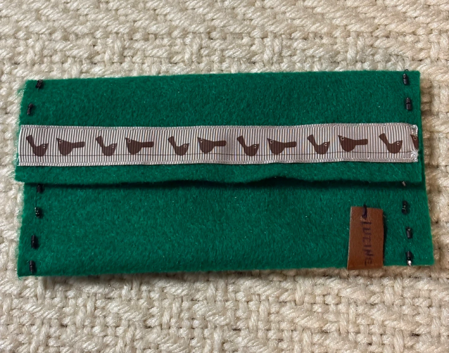 Green Felt Pouch with Bird Ribbon, handmade, new