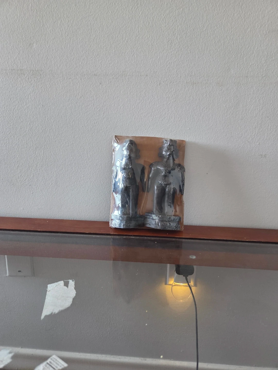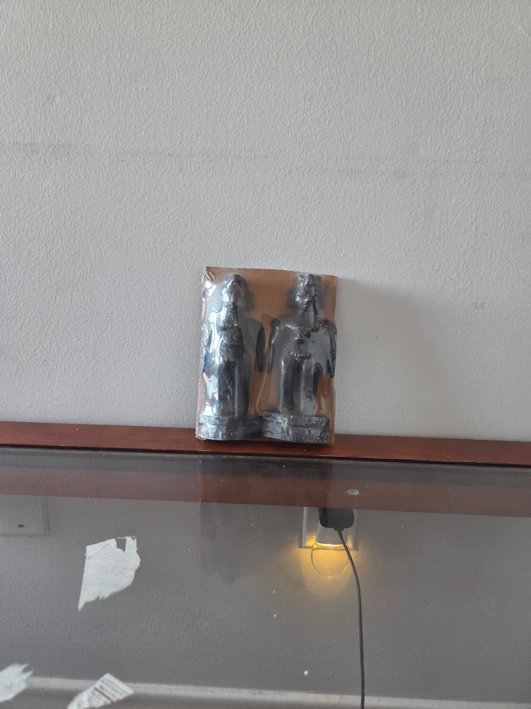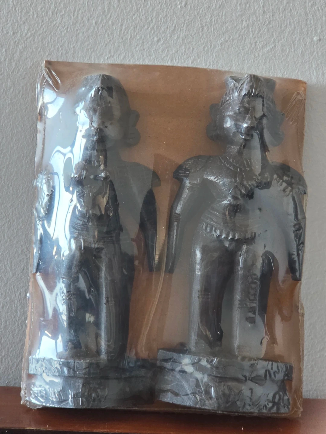 A pair of vintage Egyptian-style figures, presented in dark grey. These decorative pieces have a classical, regal appearance. They're enclosed in protective plastic packaging. Suitable for display or as a unique decorative accent.