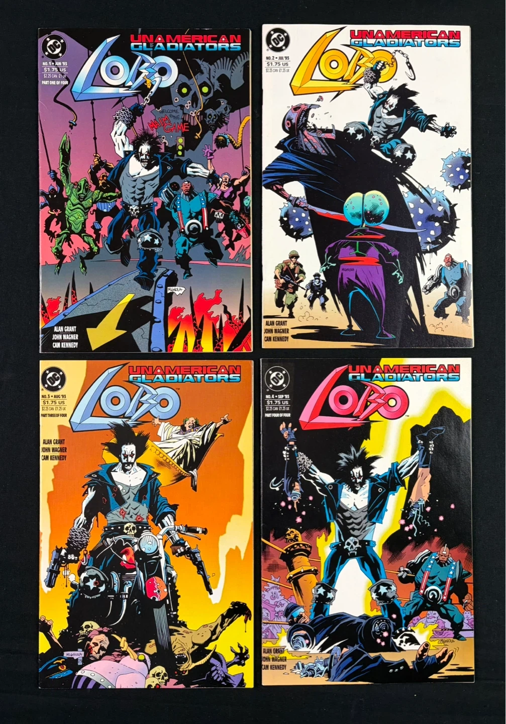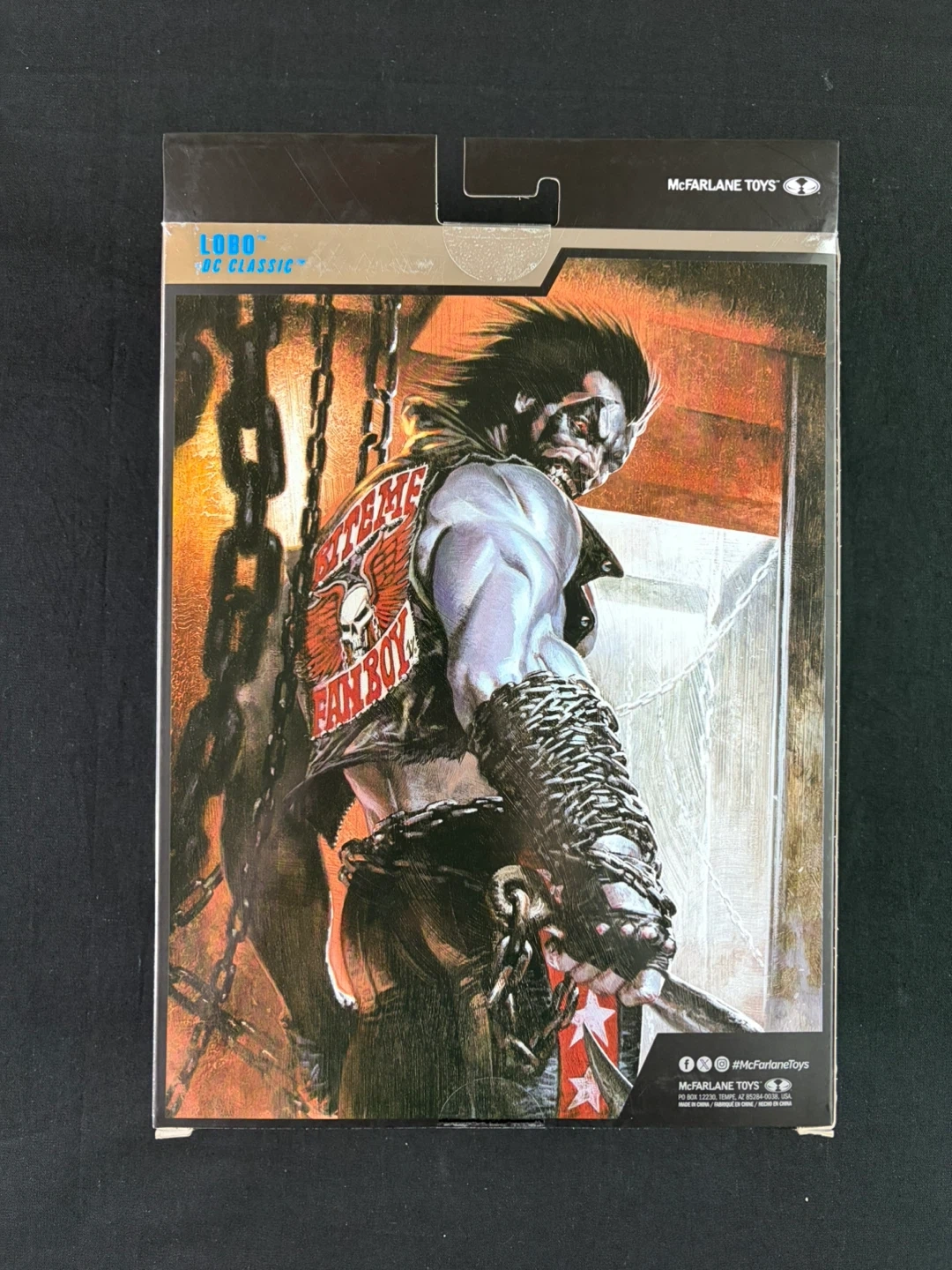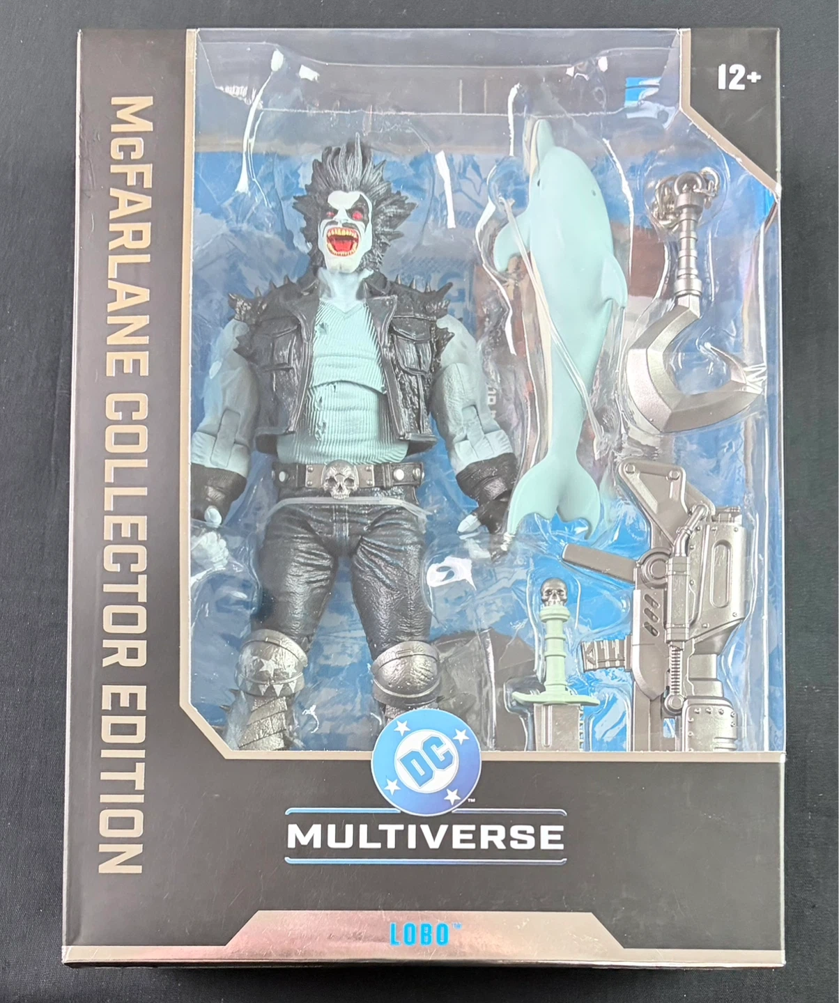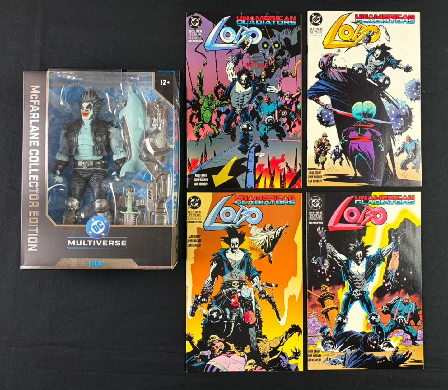 McFarlane Collector Edition DC Multiverse sealed Lobo action figure. Includes accessories and original packaging. As well as a 4 part complete set of lobo: American Gladiators comic books.