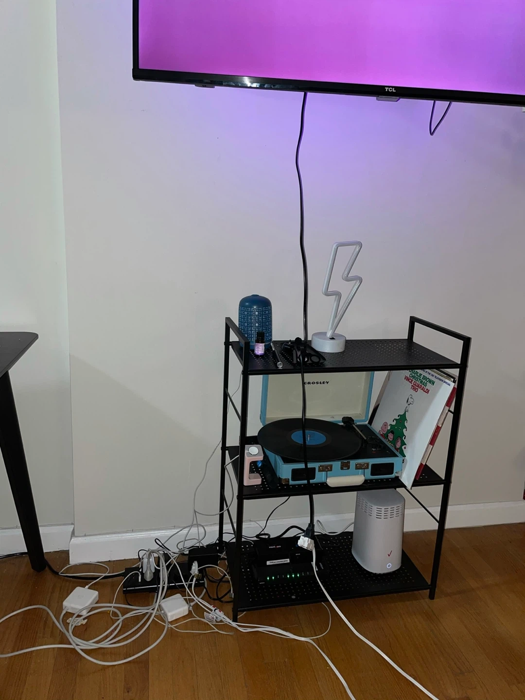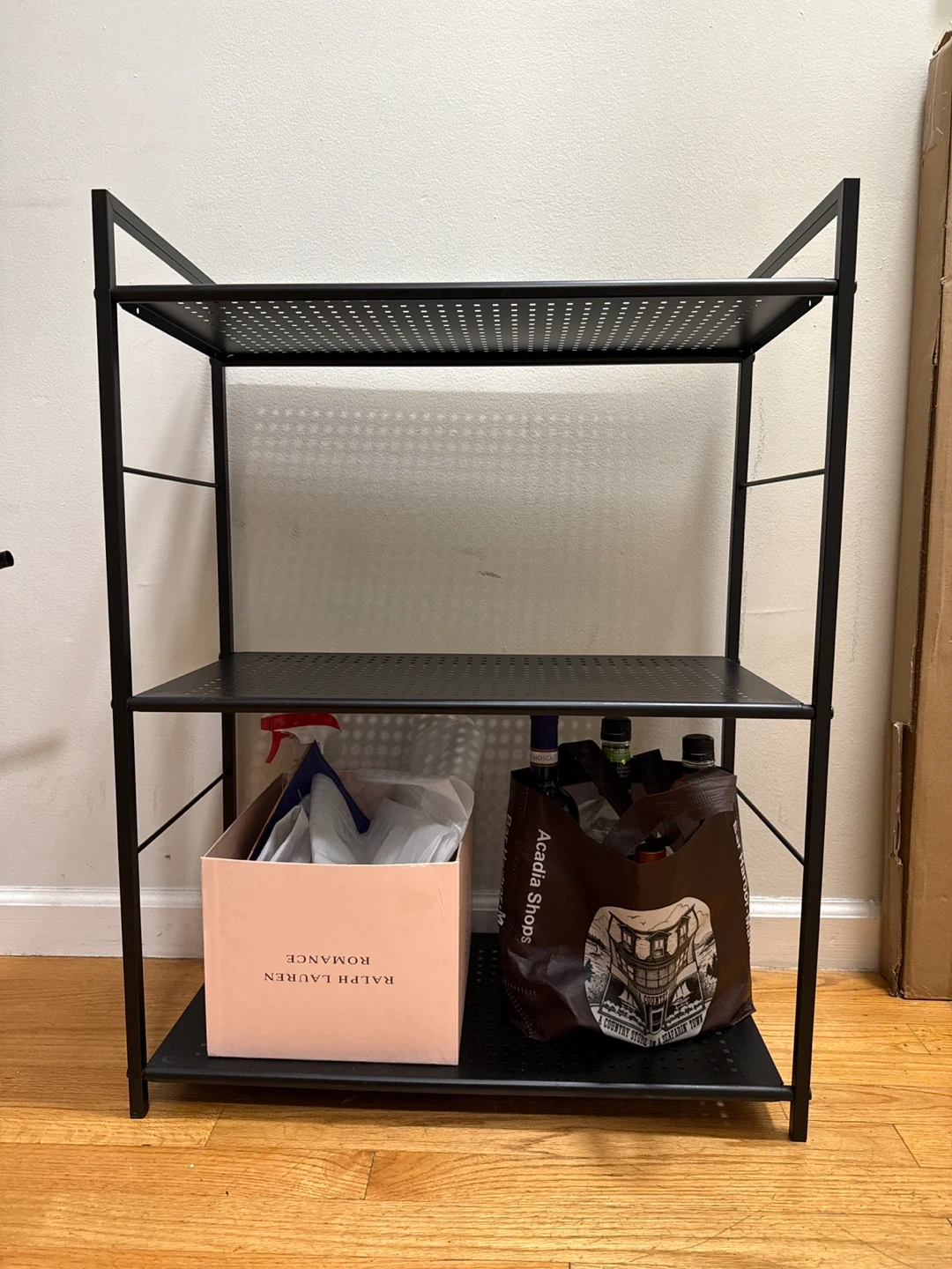 Selling a black metal three-tier shelf! It's in good condition and perfect for organizing books, plants, or anything else you need to store (maybe not as an entertainment system like we tried). It's a simple piece that would be practical in any room.