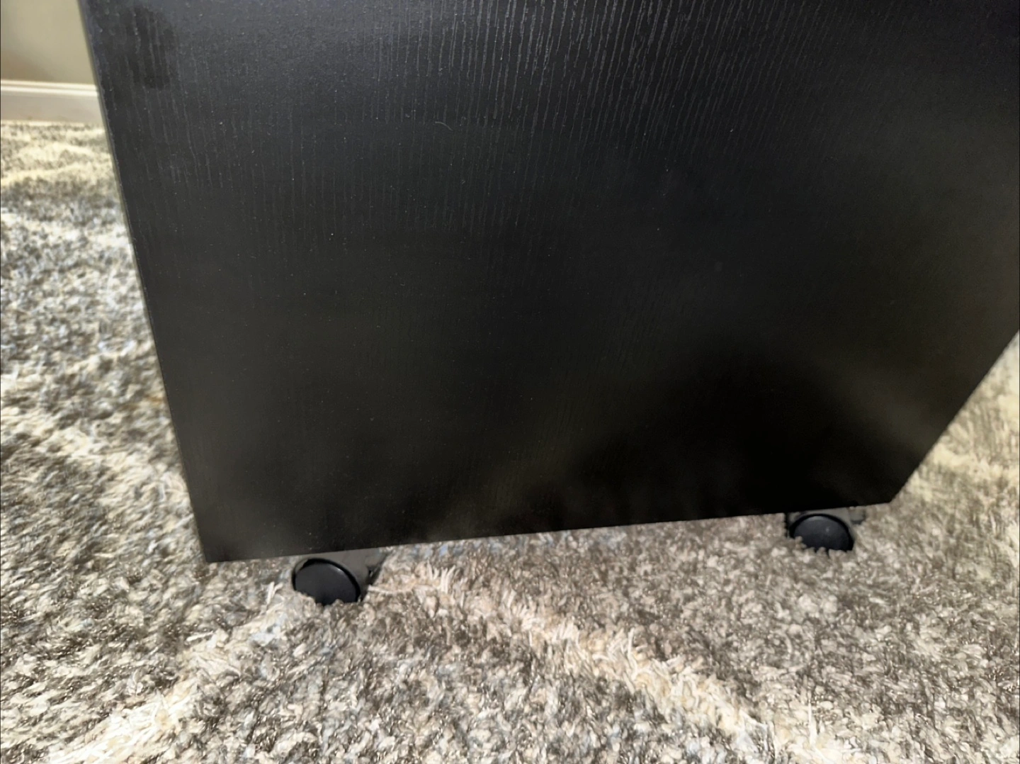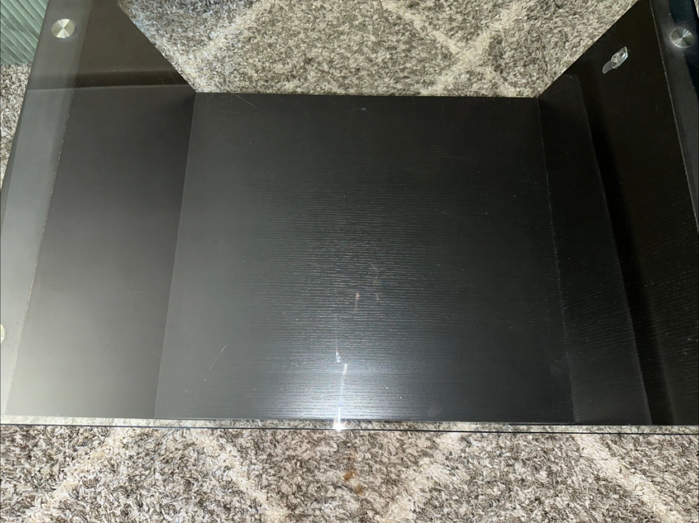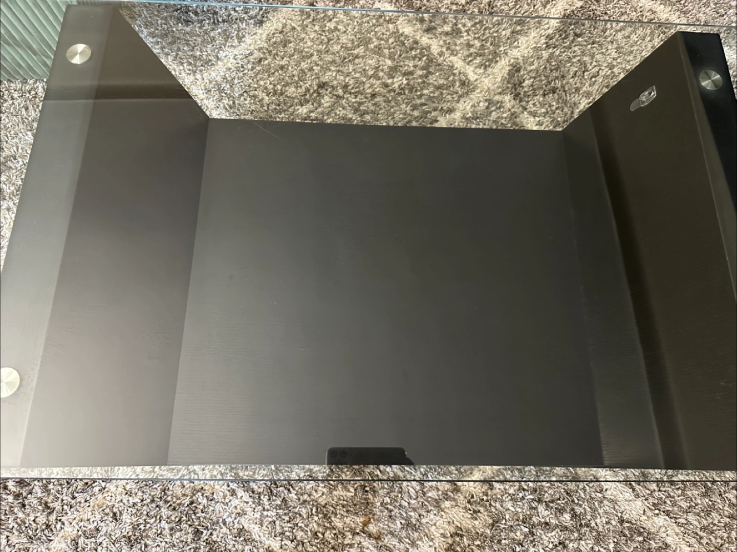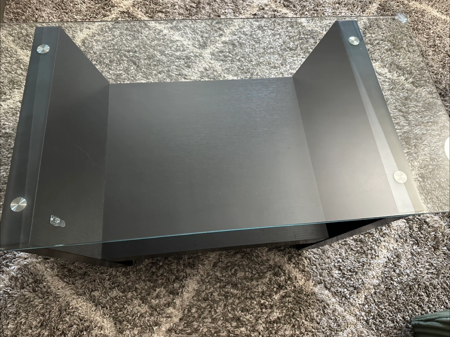 4ft x 2ft x 1.5ft (height). Glass top with black engineered wood frame with shelf. Wheels were manually placed for easy movement. Heavy. Great condition. Offers welcome. (Check out other listings with affordable price.)