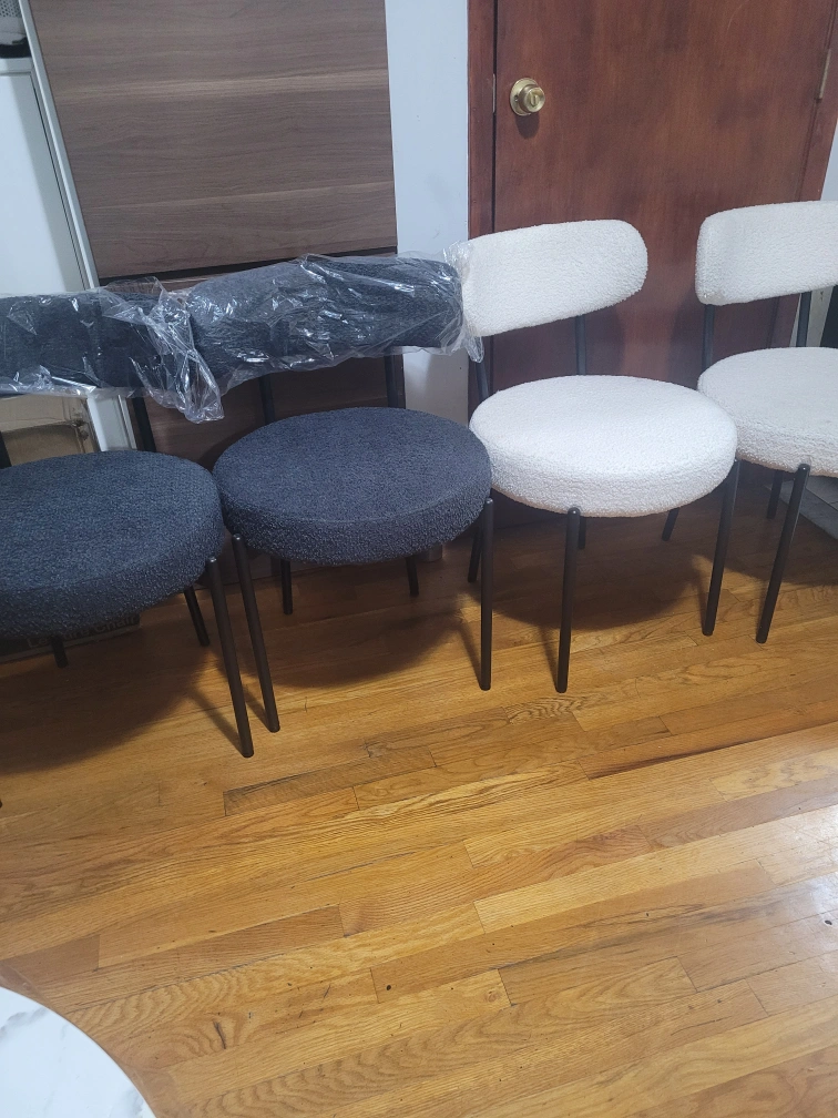 Here are some round dining chairs with boucle fabric seats. There are two in a dark gray and two in a cream color. They feature a minimalist design with black metal legs, perfect for adding a touch of modern elegance to your dining space