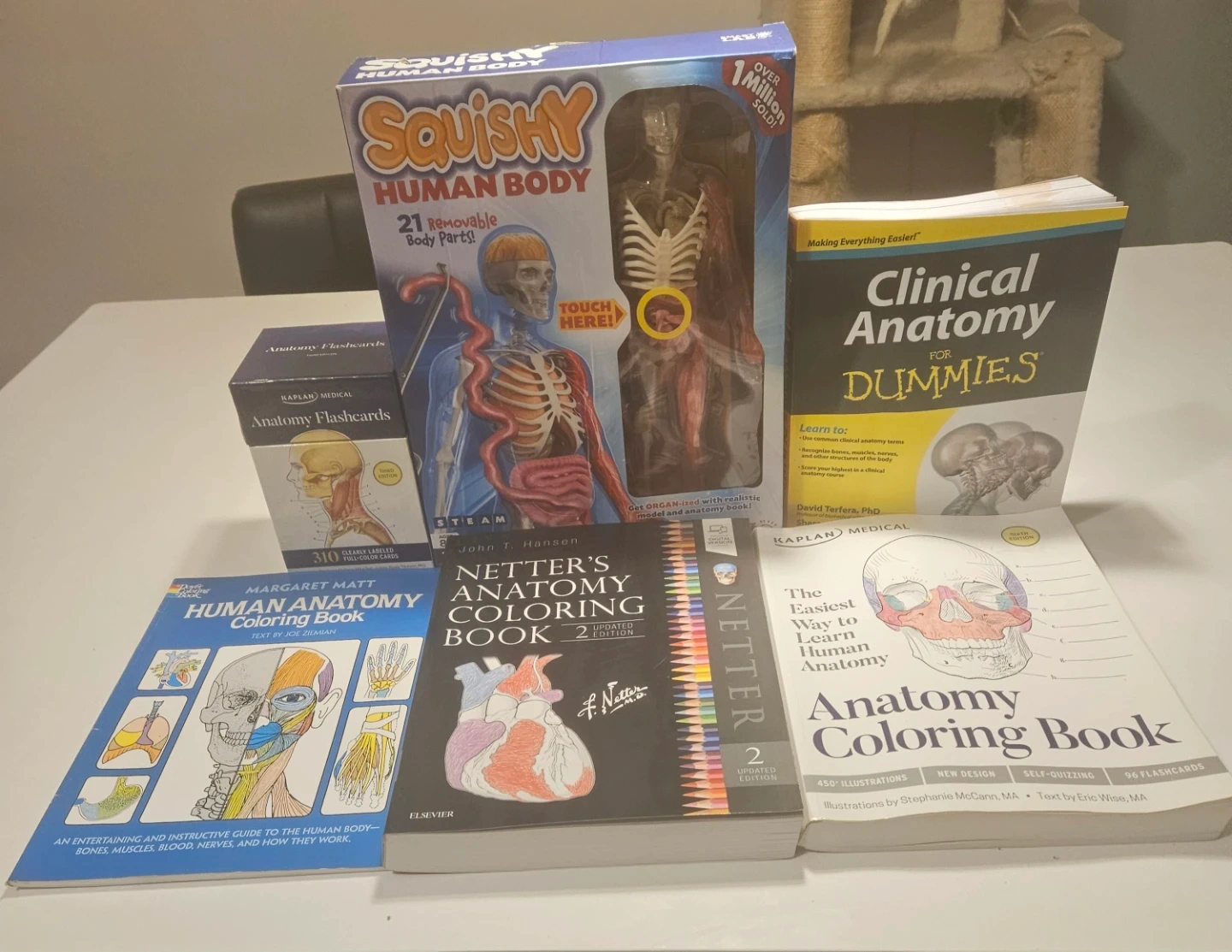 This lot includes a Squishy Human Body model with 21 removable parts. It also comes with a 'Clinical Anatomy for Dummies' book, a 'Margaret Matt Human Anatomy Coloring Book', a 'Netter's Anatomy Coloring Book 2nd Edition', a 'Kaplan Medical Anatomy Flashcards' set, and 'The Easiest Way to Learn Human Anatomy Coloring Book'. These educational resources are great for students and enthusiasts alike!